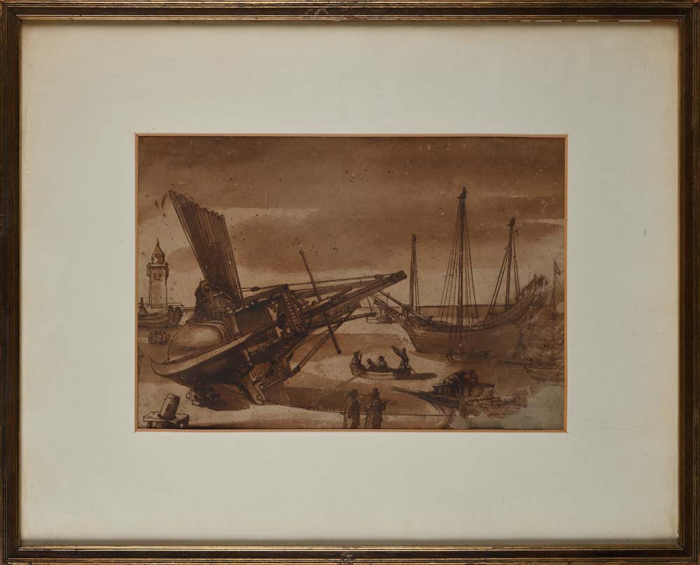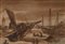 Scuola romana del XVII/XVIII secolo Studio di naufragio nel porto penna e inchiostro bruno, pennello e inchiostro acquarellato e pietra nera su carta mm 240x360 - con cornice cm 46x58