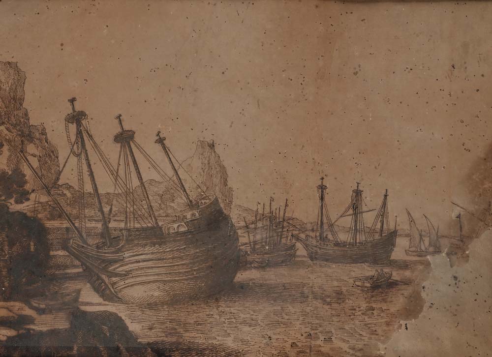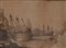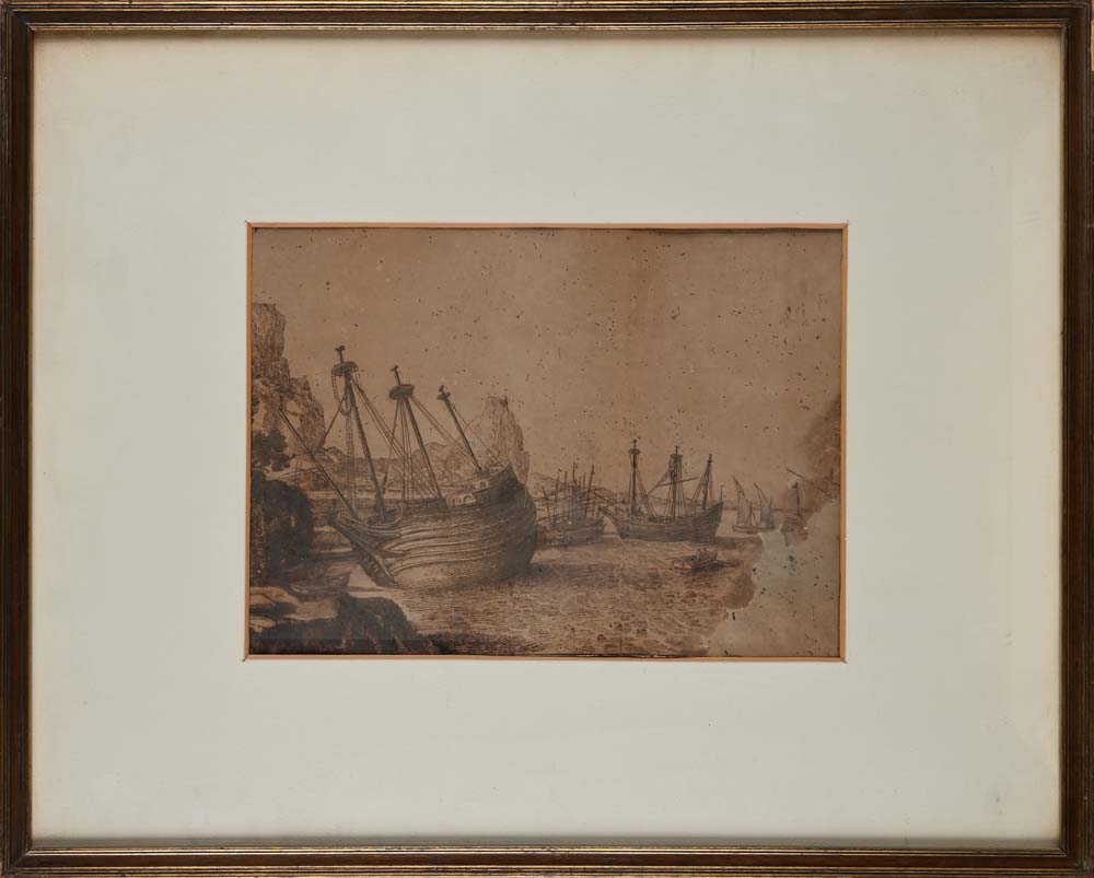 Scuola romana del XVII/XVIII secolo Studio di barche al porto penna e inchiostro bruno, pennello e inchiostro acquarellato e pietra nera su carta mm 240x350 - con cornice cm 46x58