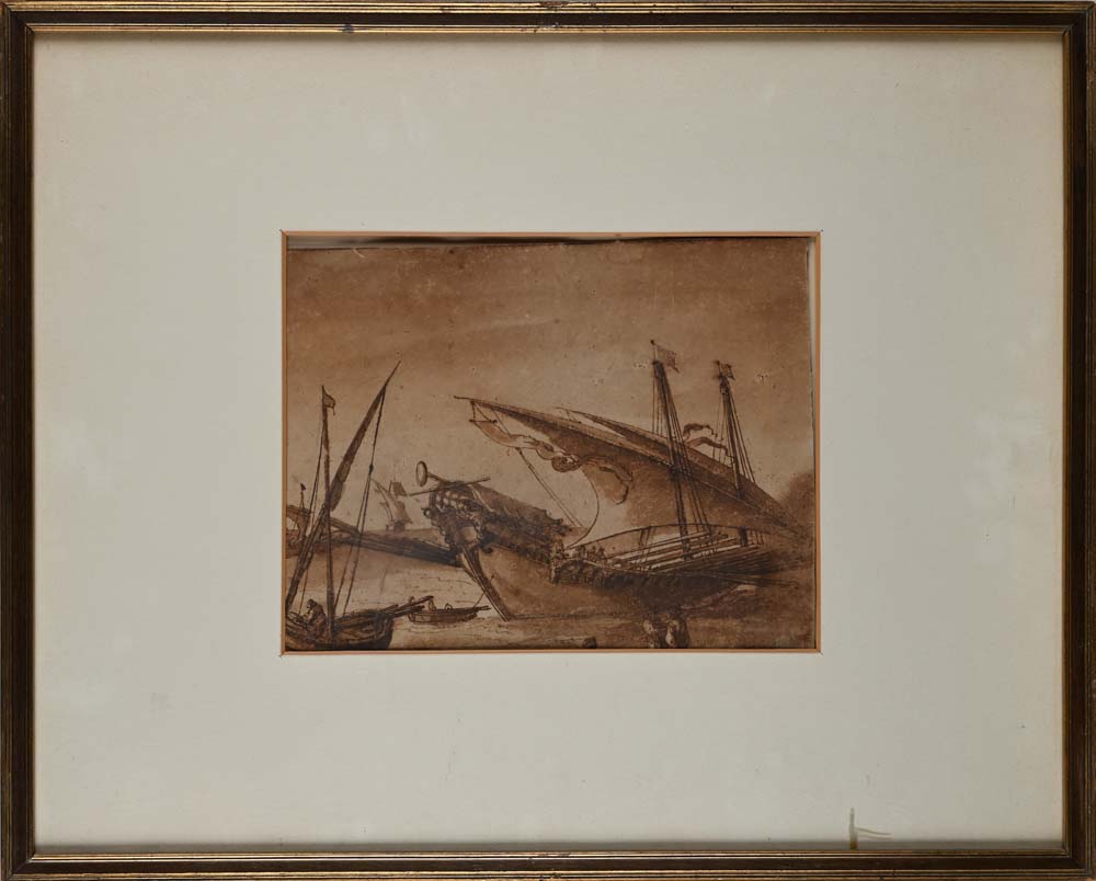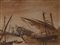 Scuola romana del XVII/XVIII secolo Studio di galera al porto penna e inchiostro bruno, pennello e inchiostro acquarellato e pietra nera su carta mm 220x280 - con cornice cm 47x57