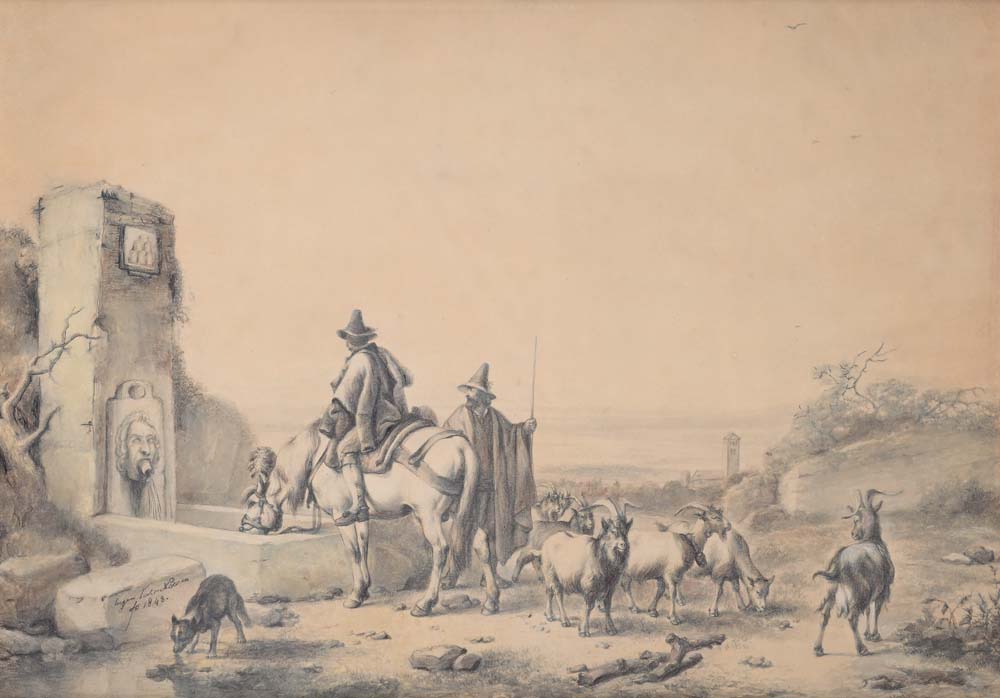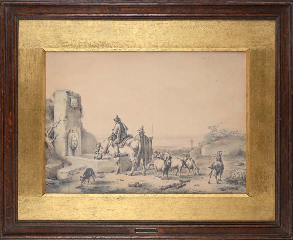 Scuola olandese del XIX secolo Butteri alla fontana acquerello su carta mm 370x510 - con cornice cm 60x75 Firmato e datato in basso a sinistra '? 1848'
