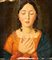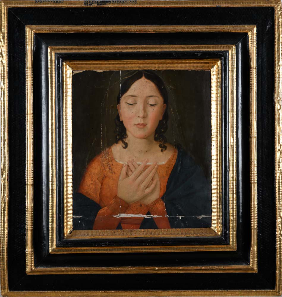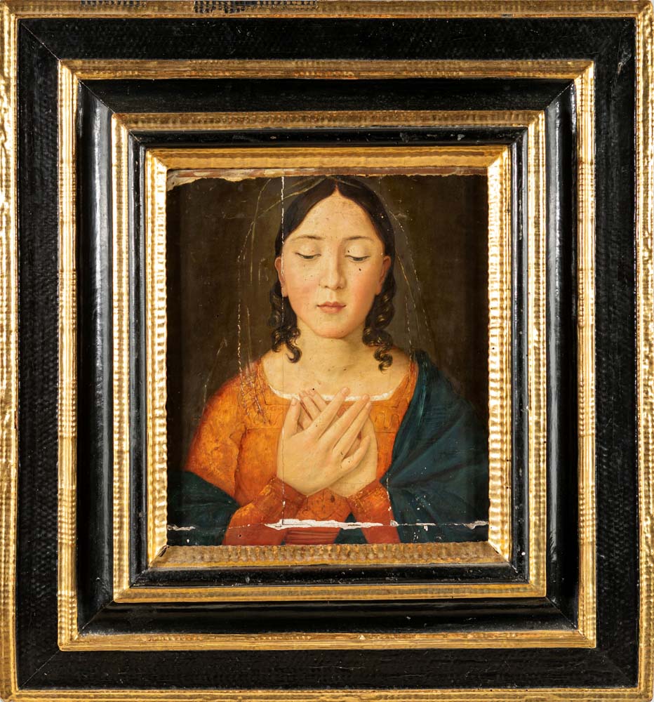 Vergine annunciata, nei modi della pittura rinascimentale olio su tavola cm 44x36 - in cornice cm 76x61 Raffigurata con lo sguardo rivolto in basso e le mani incrociate all'altezza del petto in un gesto che indica l'accettazione della volontà divina; entro antica cornice in legno ebanizzato con quattro ordini di intagli a trottola dorati