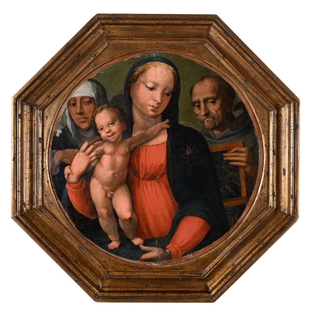 Madonna col Bambino, Santa Caterina e San Bernardino da Siena Olio su tavola diam. cm 64 - con cornice cm 79x79