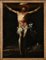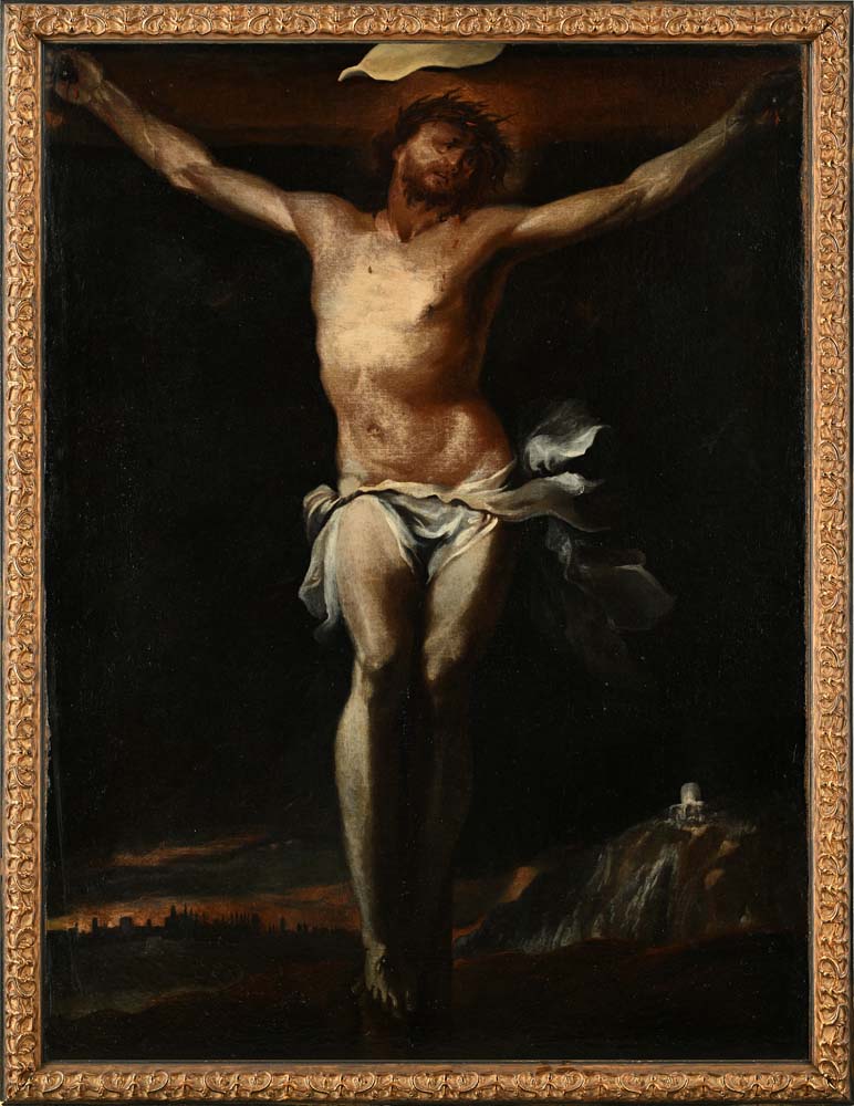 Cristo crocifisso olio su tela cm 97x73 - con cornice cm 104x80,5 Il dipinto raffigura Cristo morente sulla croce, isolato su uno sfondo scuro attraversato da un tenue paesaggio lontano. La figura emerge da un intenso chiaroscuro che esalta il realismo anatomico e la sofferenza, resa con grande intensità emotiva.