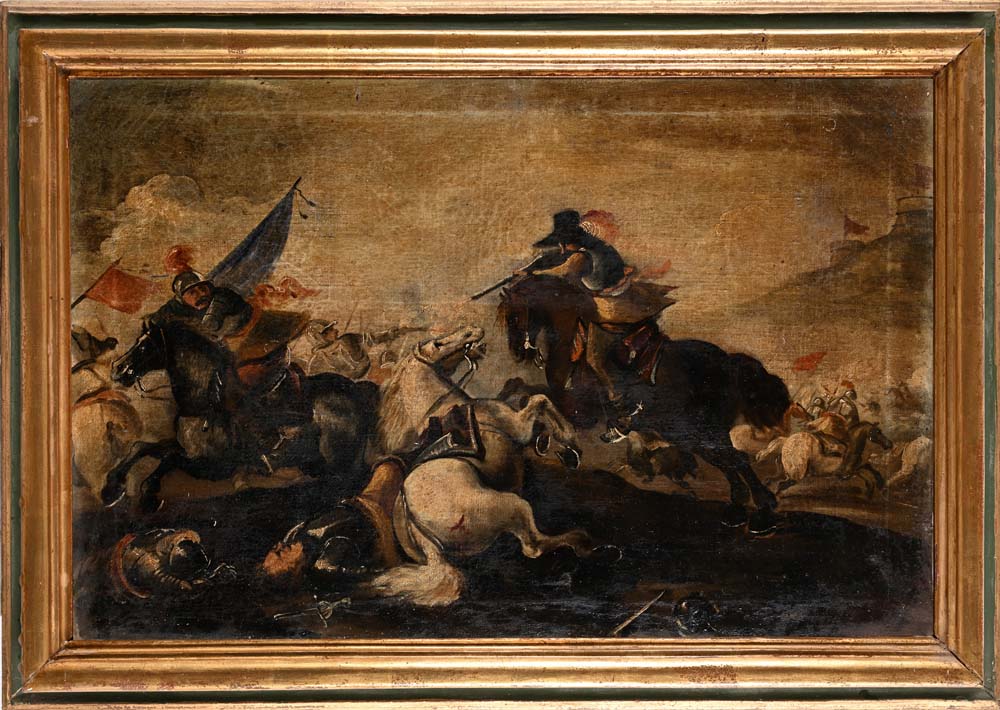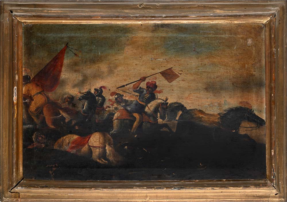 Pittore del XVIII secolo Coppia di Battaglie olio su tela a) cm 40x5x60,5 -...
