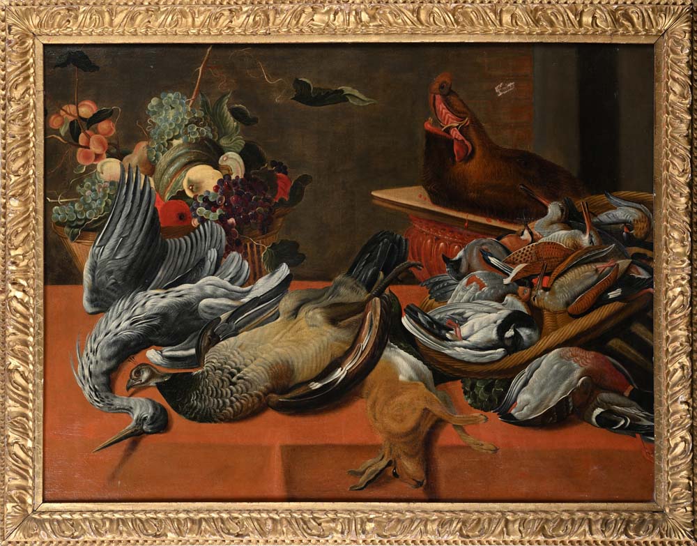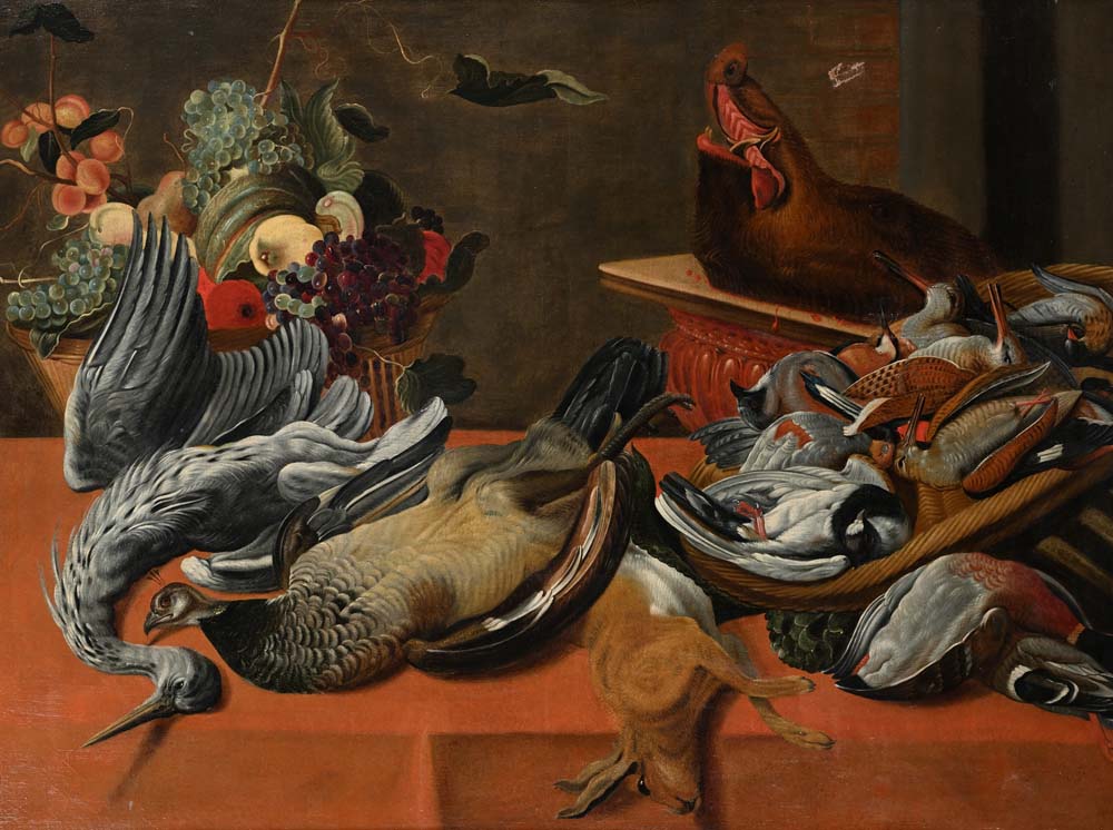 Pittore fiammingo del XVII secolo Natura morta di selvaggina olio su tela cm...