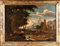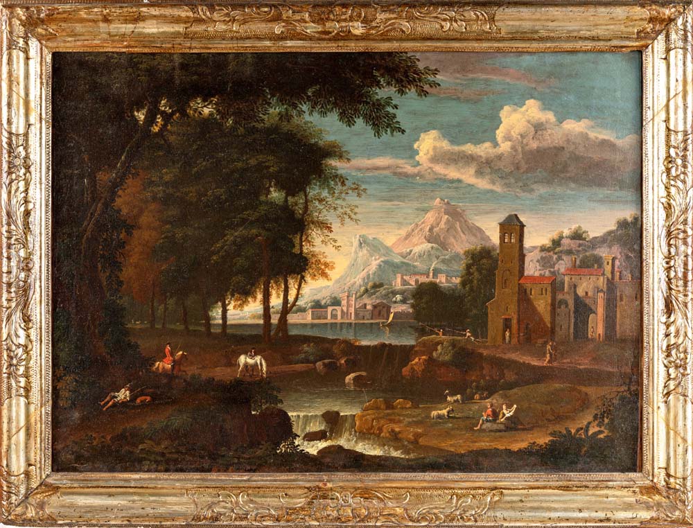 Pittore italianizzante. XVIII secolo Paesaggio di paese con montagna olio su...