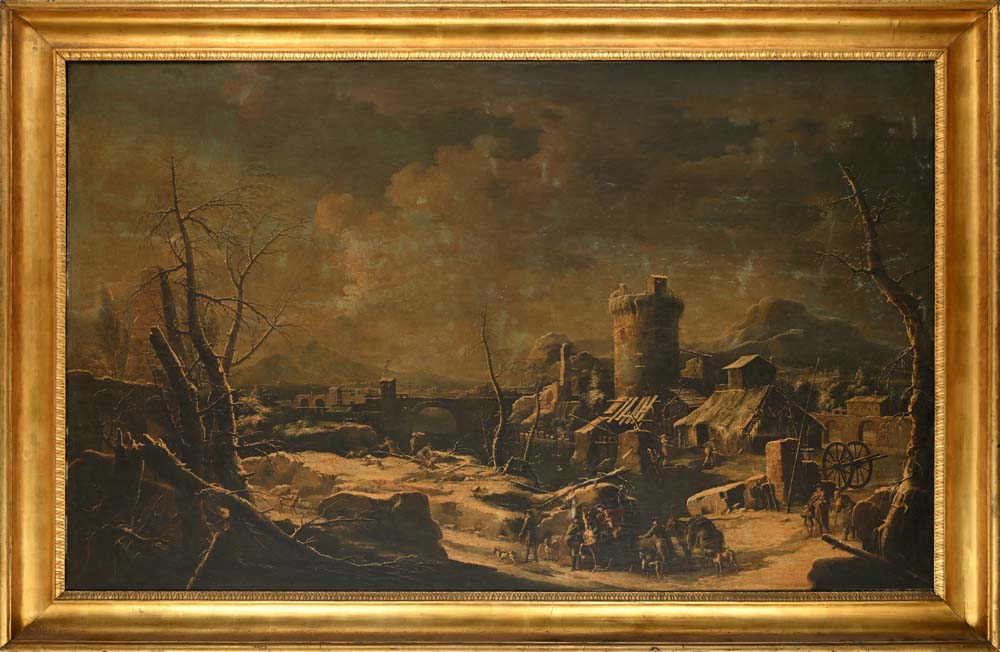 Paesaggio innevato raffigurante un villaggio con torre e figure olio su tela cm 128,5x210 - con cornice cm 152x233 Il dipinto in esame, che raffigura un paesaggio innevato con alberi spogli, edifici e figure, può