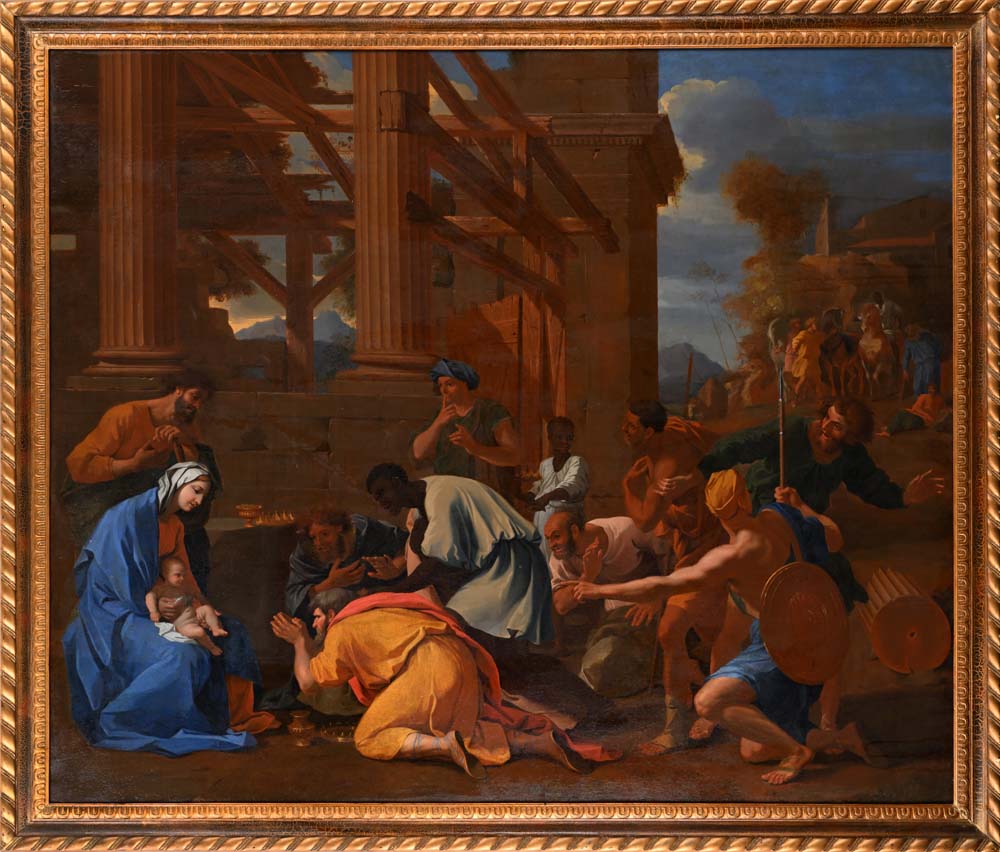 Adorazione dei Magi Olio su tela cm 151,7 x 181 - in cornice cm 166,4 x 196,2 Iscrizione in basso a destra sul frammento di colonna: A[cad Rom.] / Nicolas Poussin / f[ecit] Roma[e] 1633