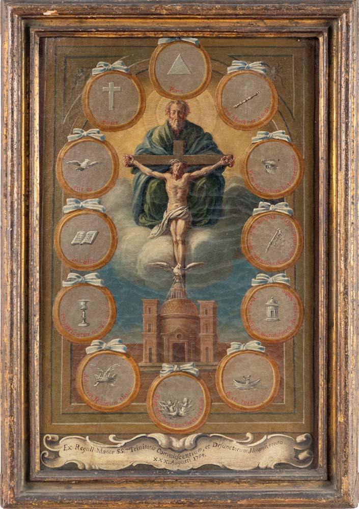 La Santissima Trinità olio su tela cm 46,5x31 - con cornice cm 54,5x38,5 Scritta in basso "Ex Regali Monte SS. Trinitatis Convalescentium, et Defunctorum Neapoli erecto XXX. Augusti 1784"