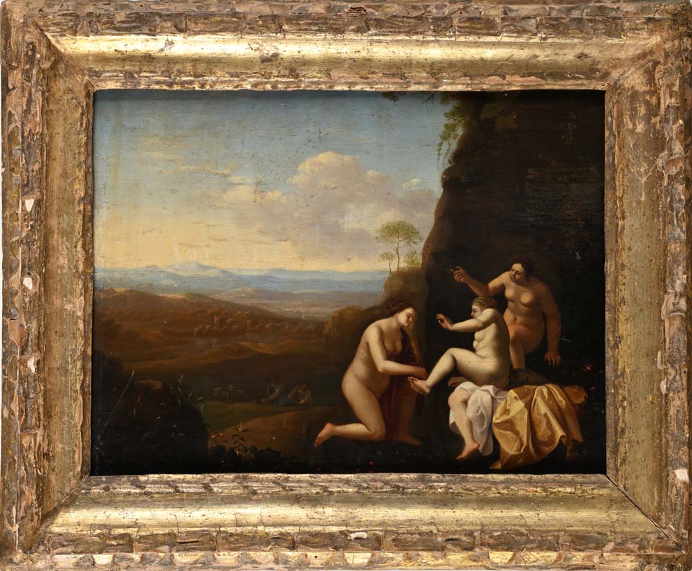 Paesaggio con ninfe olio su tavola cm 32x40 - con cornice cm 43x52 In questa tavola sono evidenti i richiami allo stile di Cornelis van Poelenburgh, grande pittore olandese nato a Utrecht intorno al 1594, che visse a Firenze al servizio della corte granducale, lasciando un consistente numero di opere nelle collezioni medicee. Il dipinto può essere datato probabilmente tra il 1621 e il 1627, durante il suo soggiorno a Roma. In primo piano verso la destra sono raffigurate tre ninfe di figure robuste e solide, un'interpretazione illusoria del nudo femminile, che rimanda alla tradizione della scultura antica. Sullo sfondo, si apre un paesaggio laziale caratterizzato da linee sinuose che sfumano verso l'orizzonte.