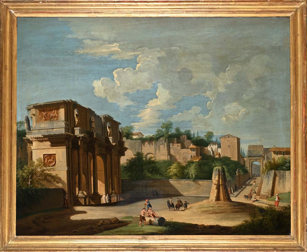 Scuola Romana del XVIII secolo Veduta di Roma con l'Arco di Costantino, la...