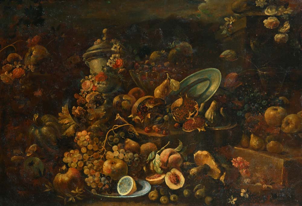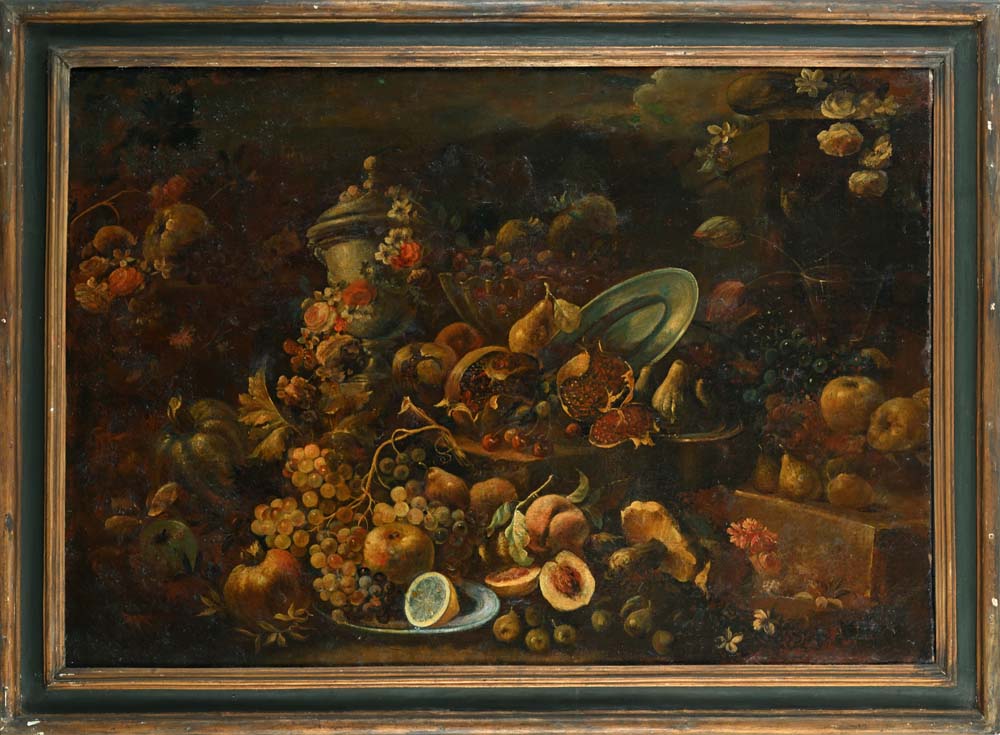 Pittore del XVIII secolo Natura morta di fiori e frutta olio su tela cm...