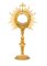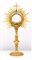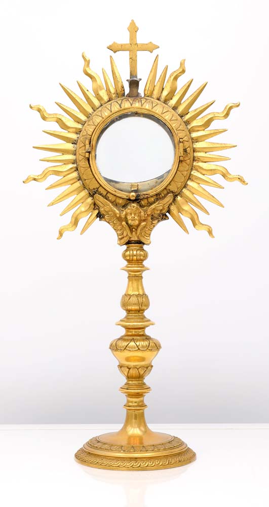 Ostensorio in bronzo dorato, XVIII secolo cm 37x19 teca circolare racchiusa da cornice a palmette, con raggiera a "sole" con raggi fiammeggianti e dritti alternati, sormontata da croce; all'interno lunetta a sostegno dell'ostia. Fusto a balaustro composito collegato alla teca da una testa di cherubino ad ali spiegate; base circolare sottolineata da due ordini di decorazione a palmette e onde continue