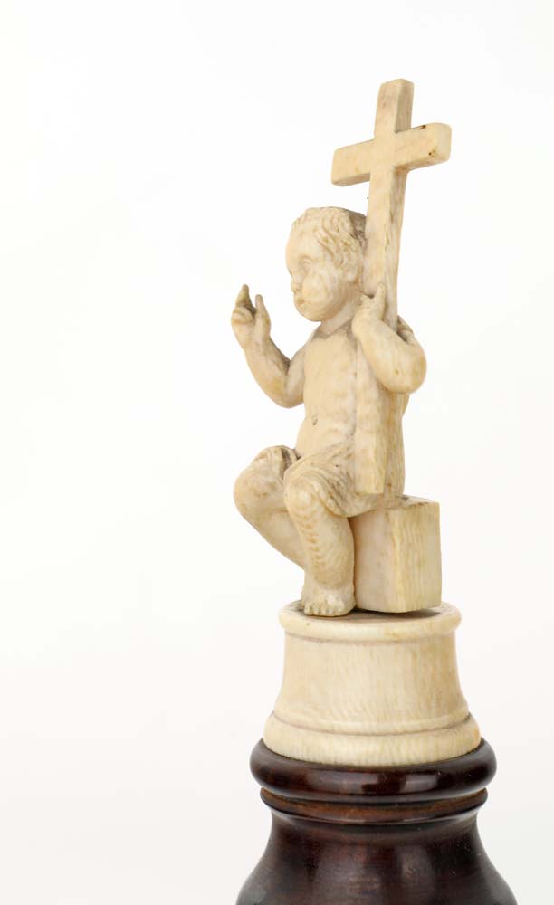 Piccola scultura in avorio raffigurante il Redentore Infante su colonnina di marmo, Italia meridionale, XVII/XVIII secolo altezza cm 30 - la figura cm 9 la figura del Cristo Bambino che abbraccia la croce è un’iconografia tipica della tradizione devozionale barocca e post-barocca e anticipa simbolicamente la Passione e si inserisce in un filone iconografico legato alla spiritualità controriformata, che esaltava la meditazione sulla Passione fin dall’infanzia di Cristo. Bambino è presentato come il Salvator Mundi con lo sguardo diretto verso l’osservatore, la mano destra in segno di benedizione e il braccio sinistro a sostegno della croce, simbolo dell'universalità della redenzione. E' ritratto seduto su un cippo e poggia su un piedistallo circolare stante su rocchetto in legno tornito e lucidato.