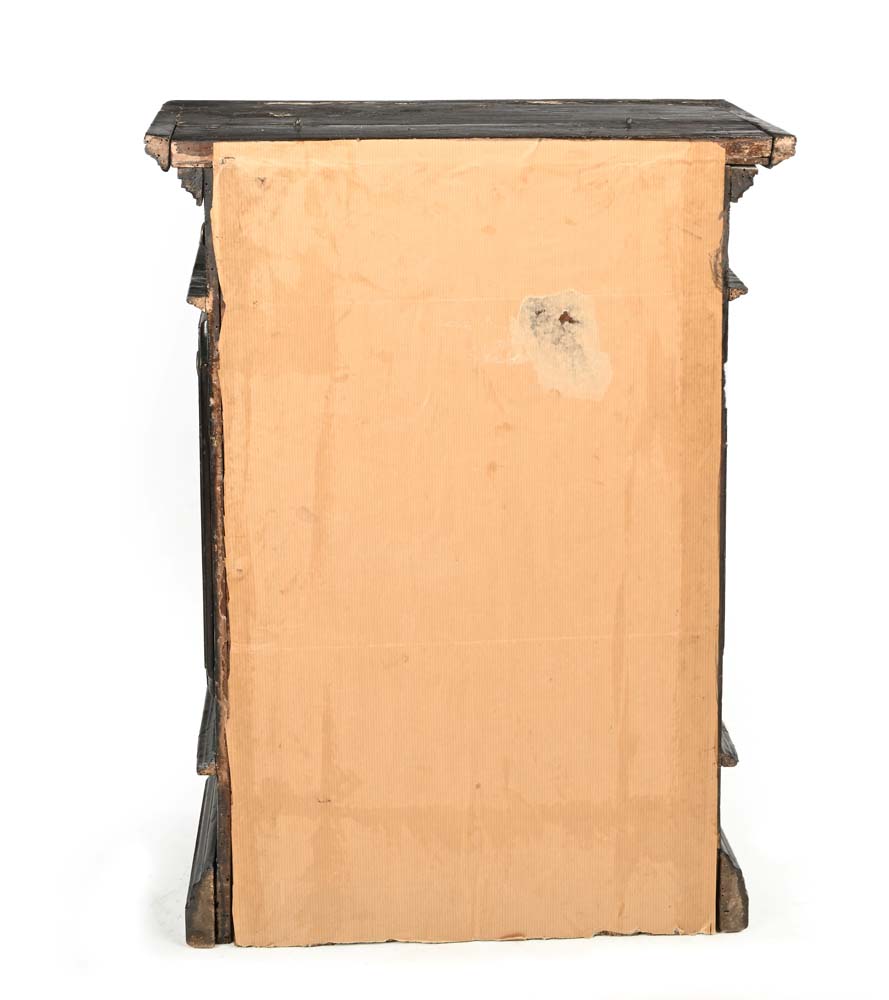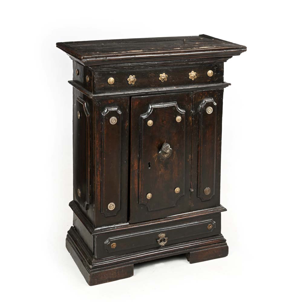 Credenzino in legno dipinto con borchie e testina in bronzo, Bologna, XVII...