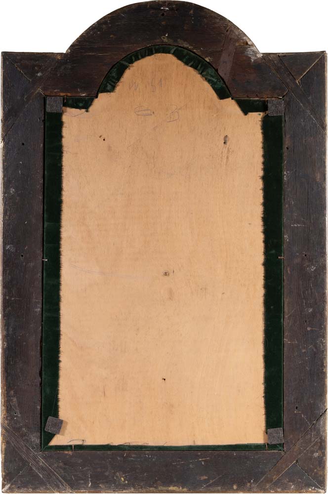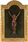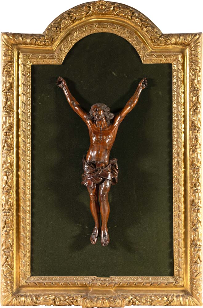 Scultura in legno raffigurante Cristo crocifisso, XVIII secolo cm 45x24,5 - la figura cm 38 - l'insieme cm 82x54 la figura del Messia è ritratta come "Christus Triumphans" con le braccia tese verso l'alto, il busto lievemente inclinato, la testa ripiegata verso la spalla destra, gli occhi spalancati rivolti verso l'alto e la bocca aperta a richiamare non solo la morte, ma anche la risurrezione; le gambe terminano con i piedi inchiodati separatamente, uno accanto all’altro; cornice rettangolare modanata a più ordini di intaglio, con sommità centinata