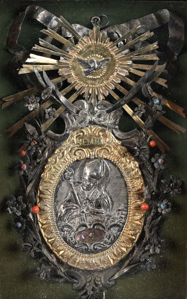 Placca devozionale in argento sbalzato e metallo dorato, XVIII secolo cm 23x14 ca. - in cornice cm 33x24,5 medaglione ovale con Santo Vescovo ritratto a mezzo busto in posa orante sotto il quale si apre una nicchia portareliquia. Cornice a palmette con cartiglio sulla sommità e iscrizione "SEMIDIO" sormontato dalla colomba dello Spirito Santo entro raggiera; l'insieme è arricchito da esili steli fioriti con inserti colorati. Non esaminato fuori dalla cornice.