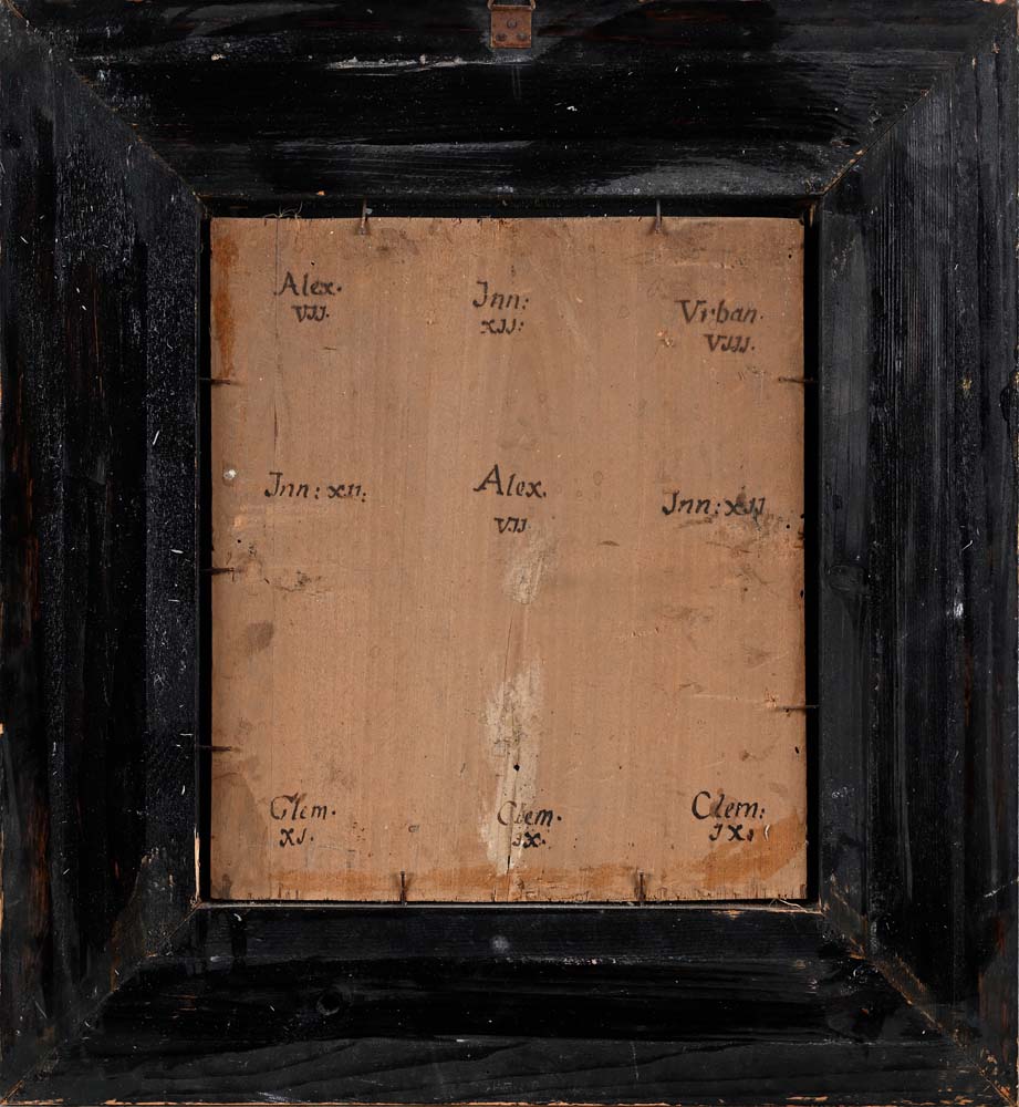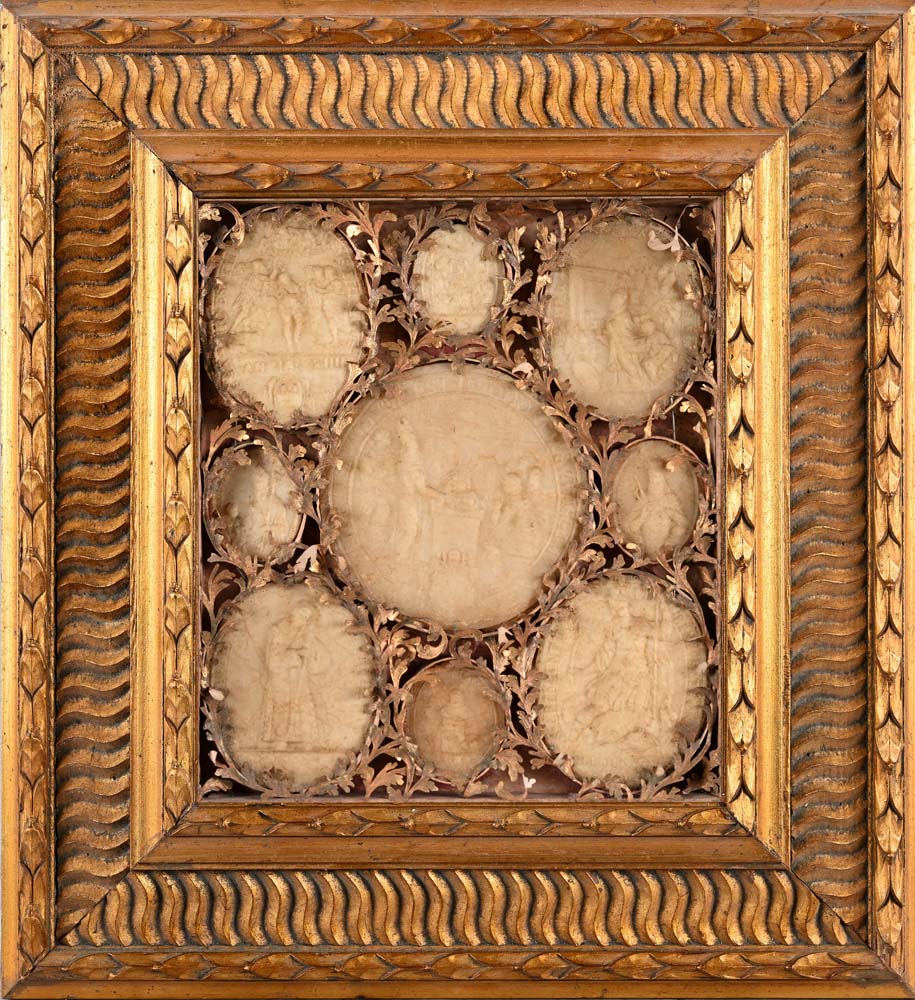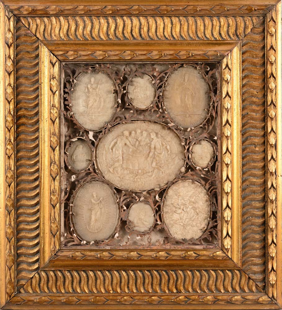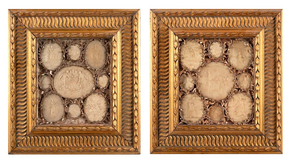 Raccolta di diciotto "Agnus Dei" del XVII e inizio XVIII secolo, entro due cornici cm 49,5x45,5 ognuno realizzati con residui dei ceri pasquali sotto i pontefici indicati ad inchiostro al verso di ogni tavola (Chigi, Pignatelli, Barberini, Albani, Rospigliosi, Alfieri). Ogni medaglione è racchiuso da una cornice in carta dorata tagliata come foglie di quercia.