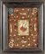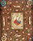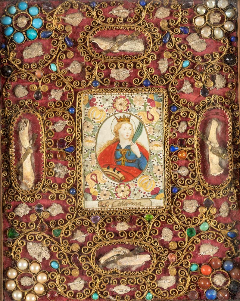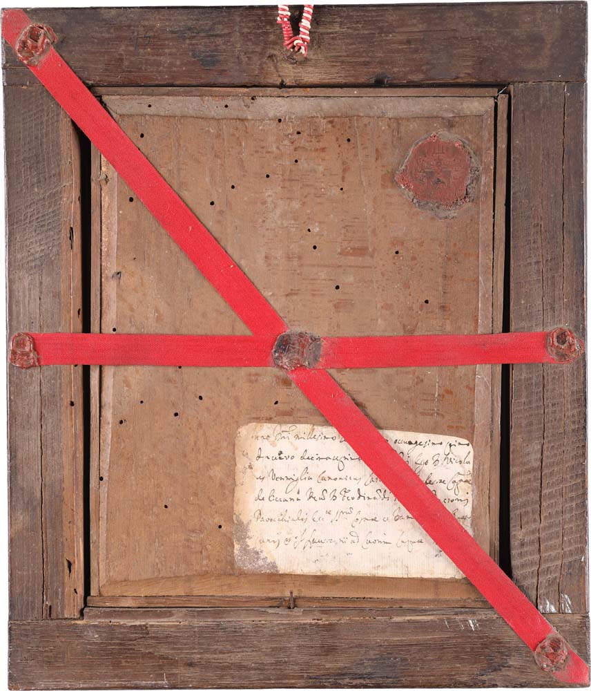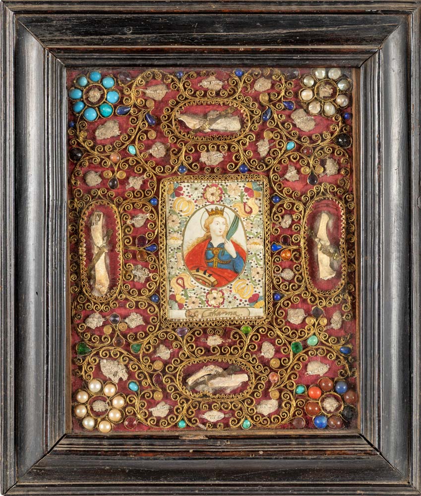 Quadro devozionale con Santa Caterina d'Alessandria, XIX secolo cm 34,5x29 l'immagine centrale è circondata da elaborati lavori in "papier roulé" arricchiti da gemme variopinte, perline ed altri elementi ornamentali. Cornice modanata in legno ebanizzato. Al verso della tavola, etichetta cartacea manoscritta e sei timbri in ceralacca rossa