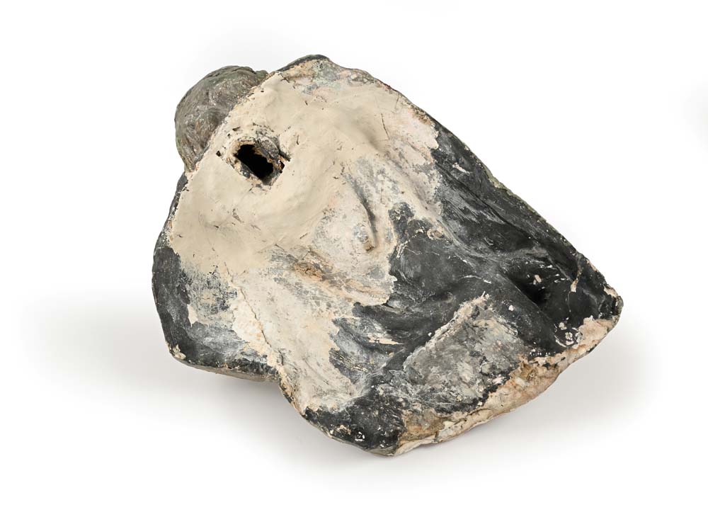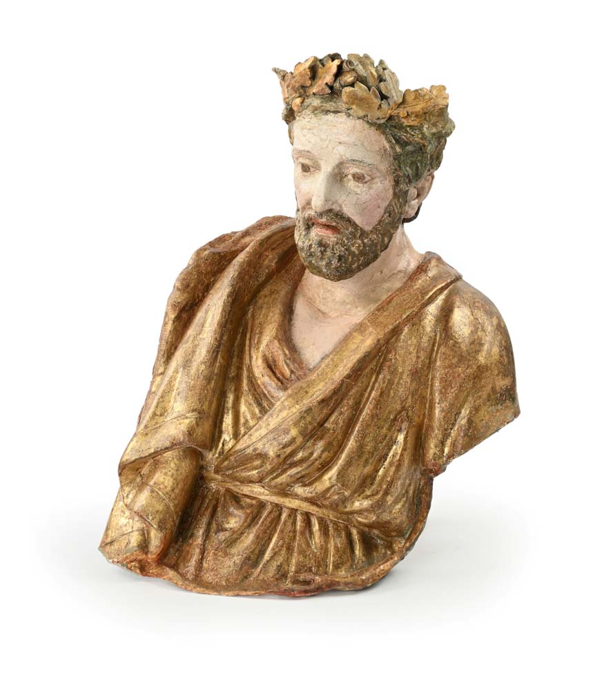 Busto di Giove in legno e cartapesta laccata e dorata, Italia settentrionale, XVII secolo cm 50x35x25 la scultura è concepita per una visione frontale, con la parte posteriore non rifinita, destinata ad essere collocata in una nicchia o contro una parete; il re degli dei è raffigurato con folta barba e la caratteristica corona con foglie di quercia; il panneggio della veste riflette la maestosità tipica delle sculture del Seicento