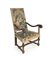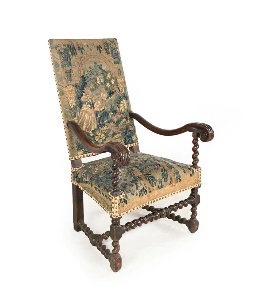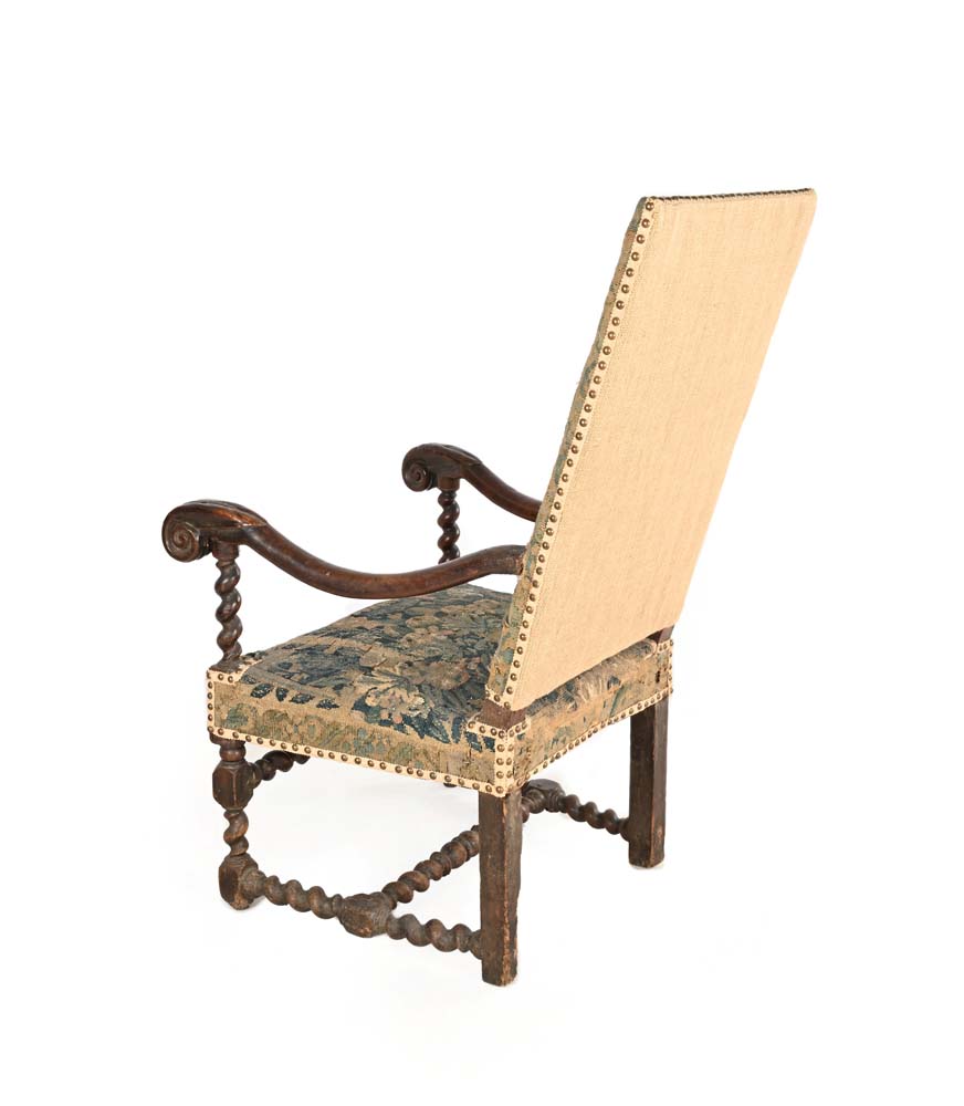 Poltrona in noce, XVIII secolo cm 113x64,5x73 schienale squadrato e sedile imbottiti rivestiti in tessuto d'Aubusson, braccioli sagomati terminanti a ricciolo su sostegni tortili; gambe anteriori composite e posteriori squadrate riunite da traverse a tortiglione