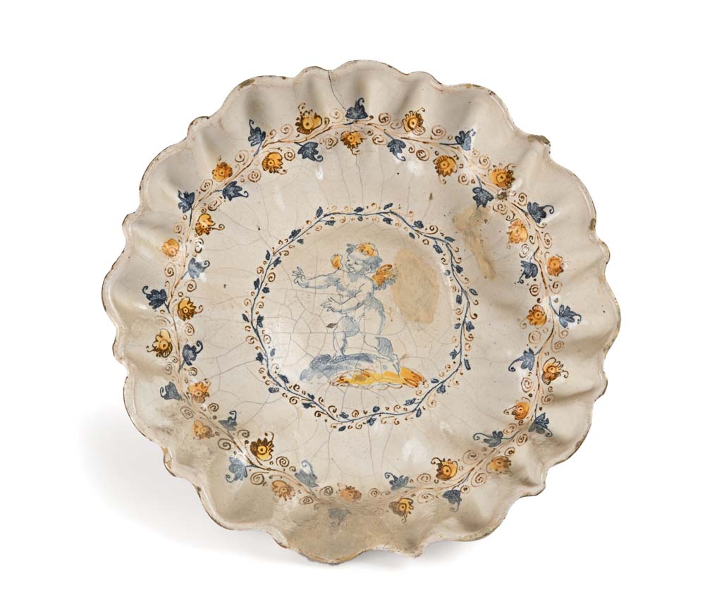 Crespina in maiolica bianca, Faenza, XVIII secolo coppa umbonata decorata da un angelo racchiuso da un'esile ghirlanda delineata in monocromia blu; parete baccellata percorsa da un tralcio nei toni del giallo e blu; orlo smerlato. Restauri