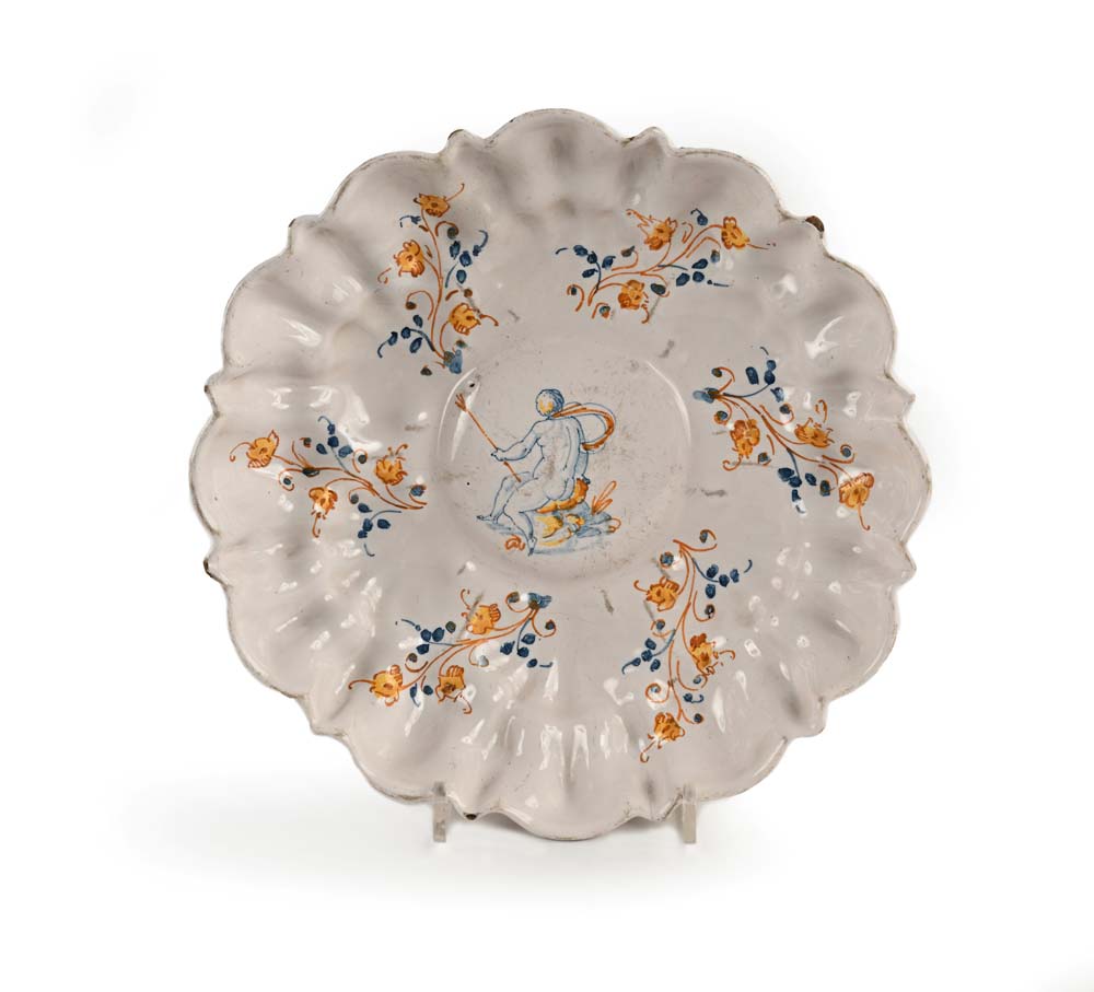 Crespina in maiolica compendiaria, Italia centrale, XVII secolo cm 7x26,5 con piatto mosso e baccellato ed orlo sagomato a smerli, caratterizzata da umbone con figura circondata da esili tralci fioriti in blu e giallo oro