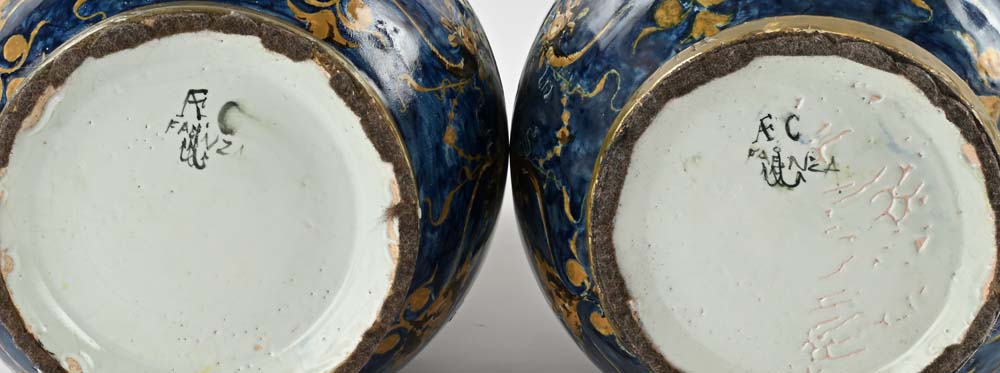 Coppia di vasi in maiolica policroma, Faenza, ambito Faventia Ars / Castellini–Masini, 1920/1940 cm 40x21 corpo ovoidale con collo strozzato e larga imboccatura svasata su piede ad anello, decorati in blu cobalto intenso, giallo, verde rame e manganese con lumeggiature in oro che impreziosiscono i dettagli ornamentali. Il corpo centrale è caratterizzato da riserve cartigliate con figure femminili sospese di Vittoria alata ispirate a Felice Giani; la fascia superiore è impreziosita da motivi a festoni, pendoni e elementi “a lambrequin” con tocchi di blu e oro; la parte inferiore reca ricca decorazione a racemi e girali su fondo blu. Recano marchio "AF C Faenza" con àncora (o monogramma stilizzato) sotto la base, riconducibile con buona probabilità alla manifattura Faventia Ars di Castellini & Masini, attiva a Faenza dal 1920 (Arte Faentina Castellini)
