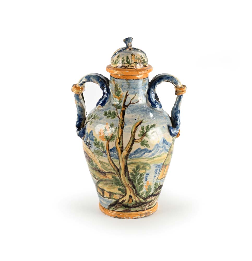 Vaso biansato con coperchio in maiolica policroma, Castelli d'Abruzzo, XIX secolo altezza cm 41 interamente decorato da un paesaggio fluviale con figura di lavandaia nei toni dominanti del blu, giallo, manganese e verde