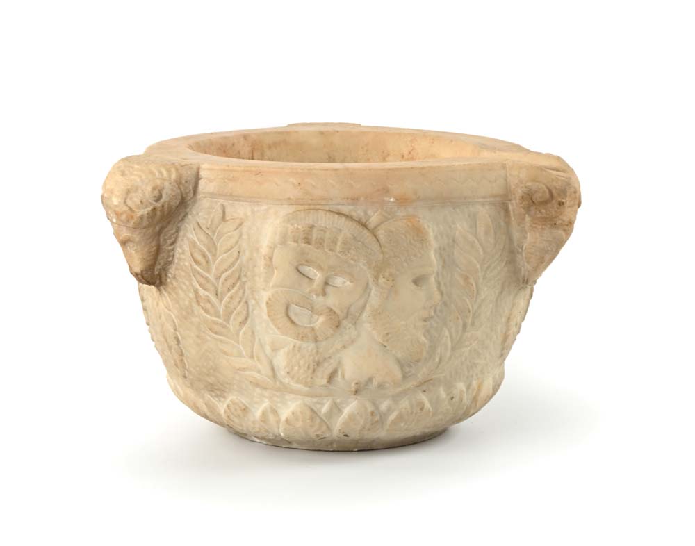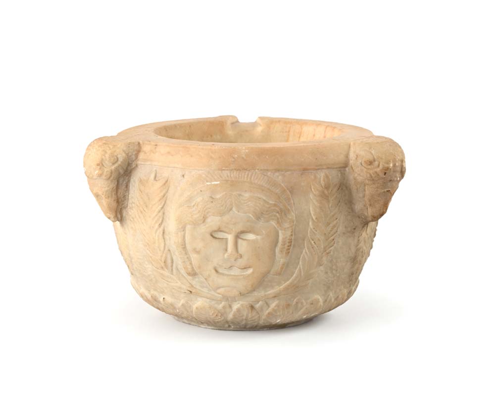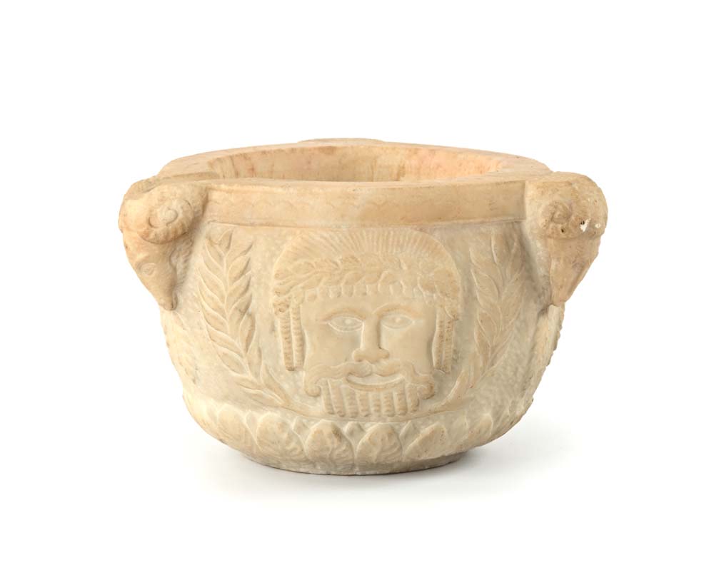 Piccolo mortaio in marmo bianco, XVII secolo cm 13x22 caratterizzato da maschere e foglie pennate e lobi a forma di protomi caprine, di cui uno segnato da lunga scanalatura