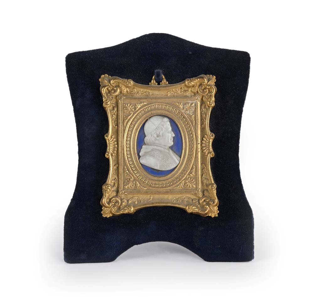 Cammeo ovale con profilo di Papa Pio IX, metà del XIX secolo cm 4,5x3,5 - in cornice cm 10x8,5 - l'insieme cm 17x13,5 entro cornice in bronzo dorato con rilievi a palmette, motivi vegetali e conchiglie; supporto sagomato rivestito in velluto azzurro