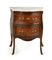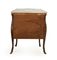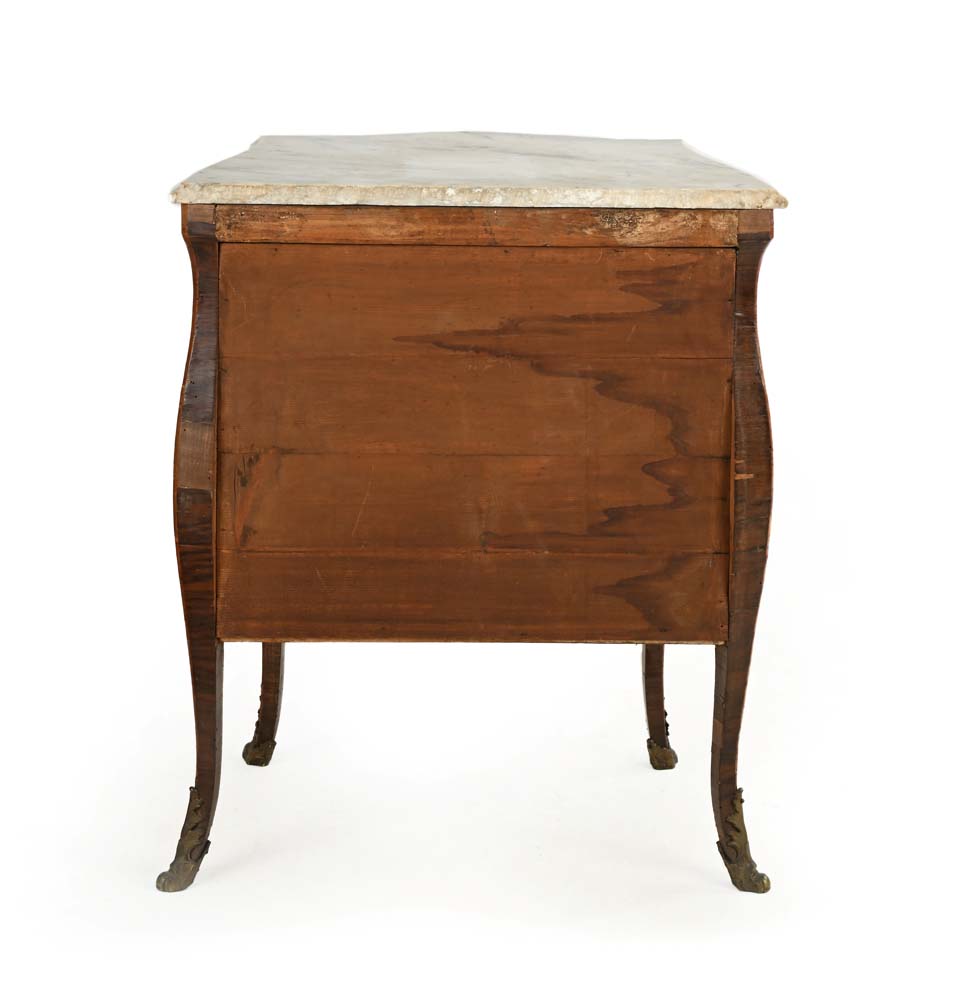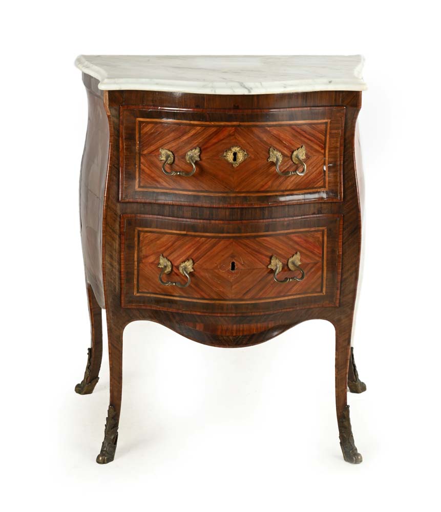 Piccolo cassettone in legno a fibre contrapposte, Napoli, XVIII secolo cm 85x70x43 di forma sagomata con piano in marmo bianco, reca facciata suddivisa in due cassetti con bocchette e maniglie in bronzo dorato; spigoli curvilinei, gambe sfuggenti calzate di scarpette