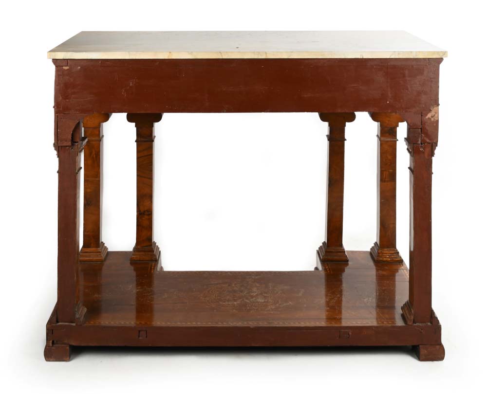 Console Carlo X in radica di noce con intarsi in legno di frutto, Napoli, prima metà del XIX secolo cm 93x121x58 rifinita superiormente da piano rettangolare in marmo, è impreziosita da tarsie a volute fogliacee stilizzate racchiuse da sottili filettature in legno di frutto poste a cornice delle varie partizioni, unitamente a bordure intarsiate a tasselli diagonali a simulare un cordolo. Fascia rettilinea sottolineata da un motivo centrale a volute contrapposte che idealmente separa archi di gusto neogotico, sorretti da sostegni in forma di colonna di cui le quattro frontali sono rifinite da capitelli ionici; base sagomata