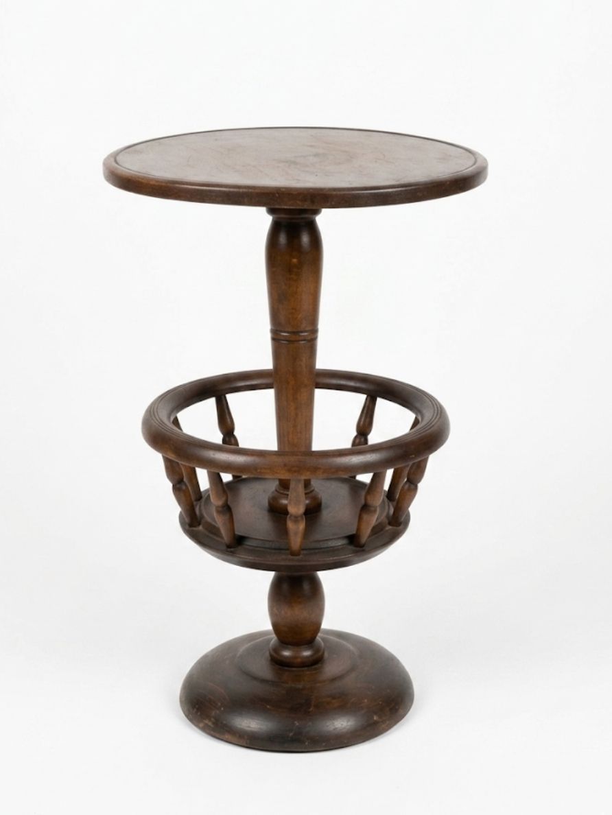 La particolarità del pezzo risiede nella presenza di un vano intermedio a cestello (o ringhiera), delimitato da piccoli balaustri torniti, originariamente concepito come porta-lavoro (per il cucito) o come porta-riviste e tabacco. Il piano superiore è circolare e presenta un bordo leggermente modanato, offrendo una superficie d'appoggio ideale per una lampada o per l'uso da salotto.