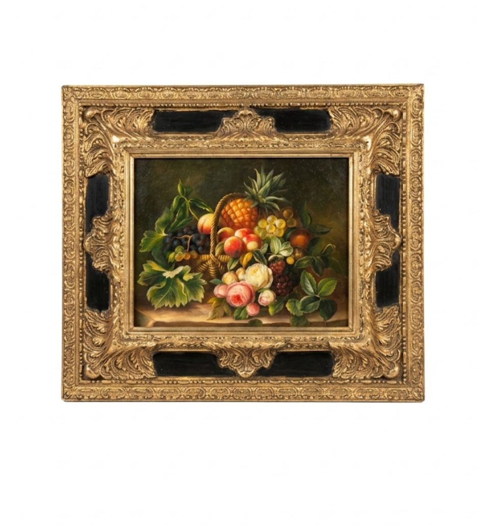 Pregevole dipinto ad olio raffigurante una ricca ed opulenta composizione di frutta. Al centro della scena spicca un cesto intrecciato ricolmo di frutta esotica, tra cui un ananas finemente dettagliato, pesche mature, uva nera e bianca, e fragole. La composizione è impreziosita in primo piano da un mazzolino di rose dai toni delicati, che richiama il lotto floreale correlato.