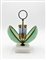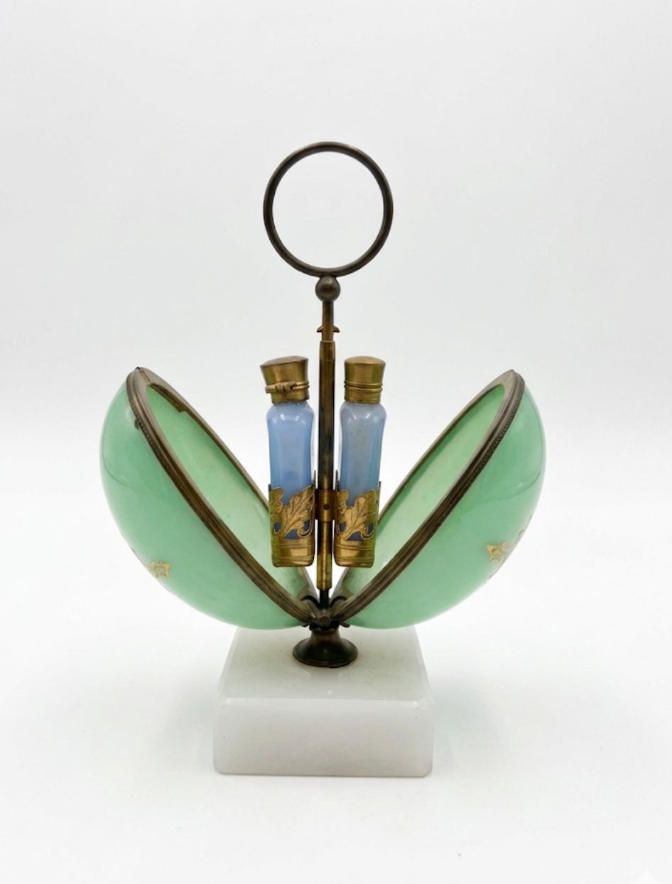 Raro e prezioso necessaire da viaggio o da tavolo a foggia di uovo apribile. L'involucro esterno è realizzato in pregiata opaline verde mela, decorata con piccoli motivi floreali dorati. La struttura, azionata da un raffinato meccanismo in ottone dorato, si apre a corolla rivelando al suo interno due flaconi porta-profumo.
