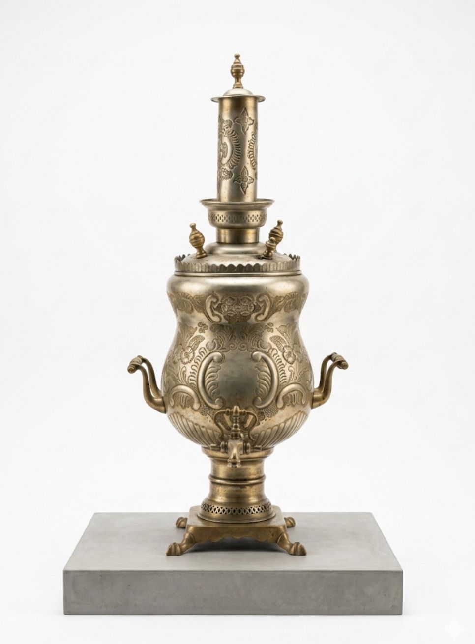 Grande Samovar monumentale in metallo sbalzato e inciso Produzione di area russa