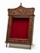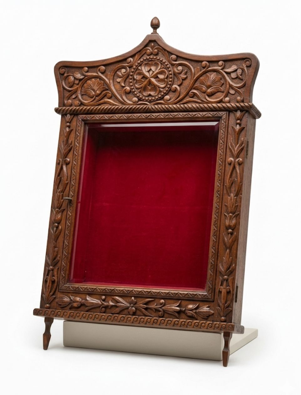 La cornice della bacheca è anch'essa interamente intagliata con motivi a ghirlanda e tralci vegetali che corrono lungo tutto il perimetro. All'interno, il vano espositivo è rivestito in velluto rosso cremisi, ideale per far risaltare il contrasto cromatico con oggetti in argento, gioielli o medaglie.