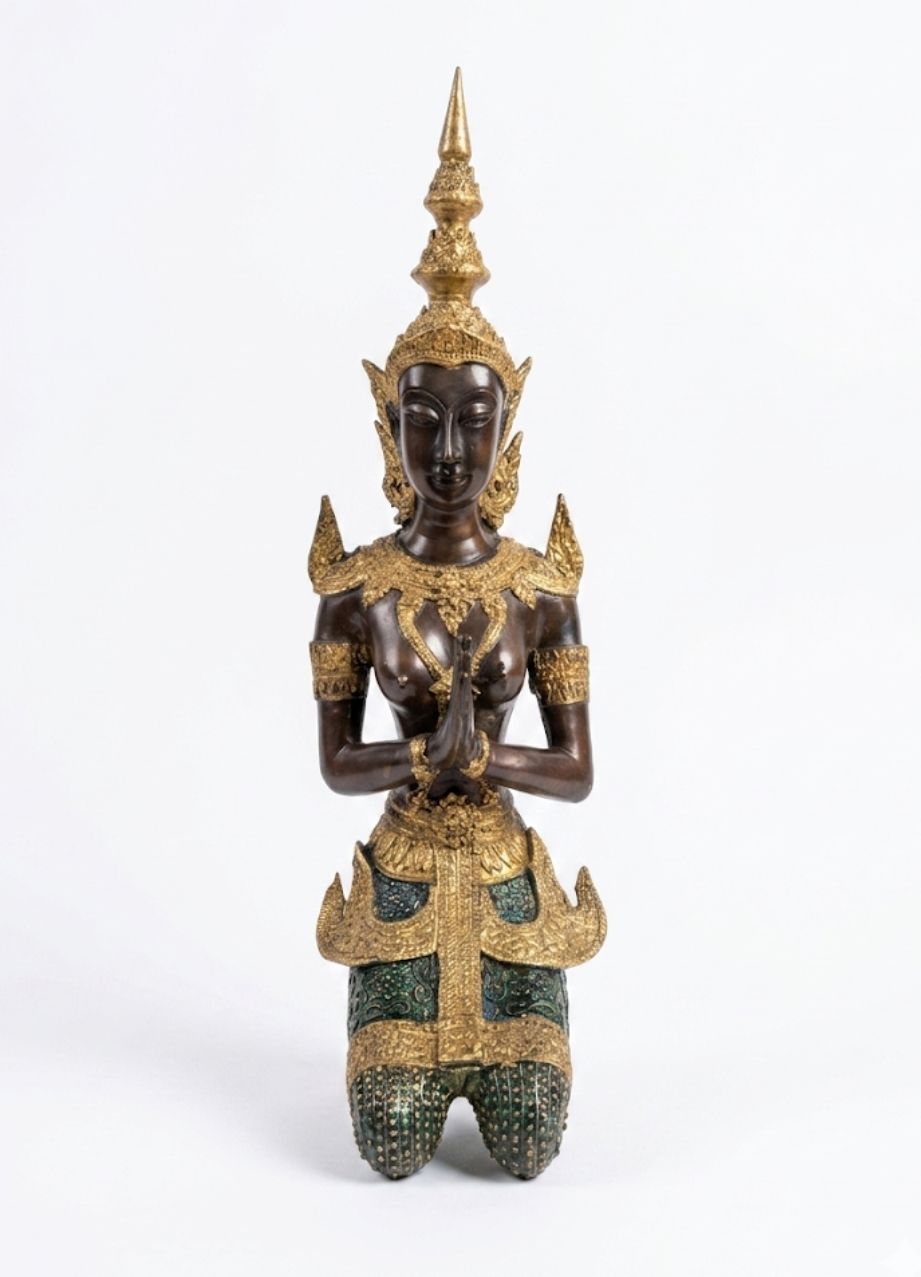 Pregevole scultura in bronzo raffigurante un Thepanom, un angelo custode o divinità minore della tradizione buddhista thailandese, colto nella tipica posizione inginocchiata con le mani giunte nel gesto del saluto e della preghiera (Anjali Mudra).