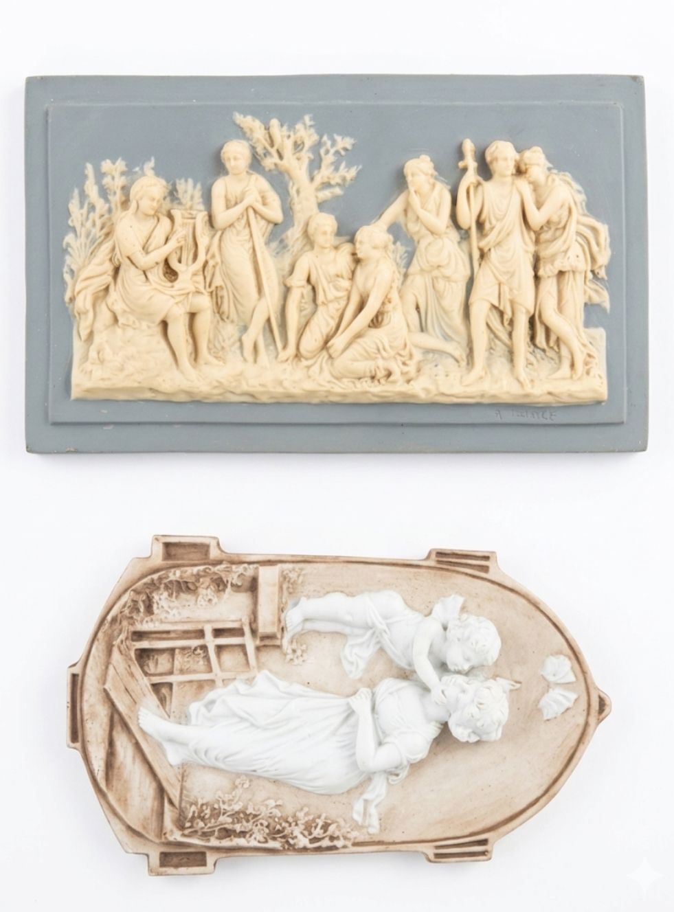 Lotto composto da due placche finemente lavorate a rilievo, caratterizzate da una raffinata estetica accademica