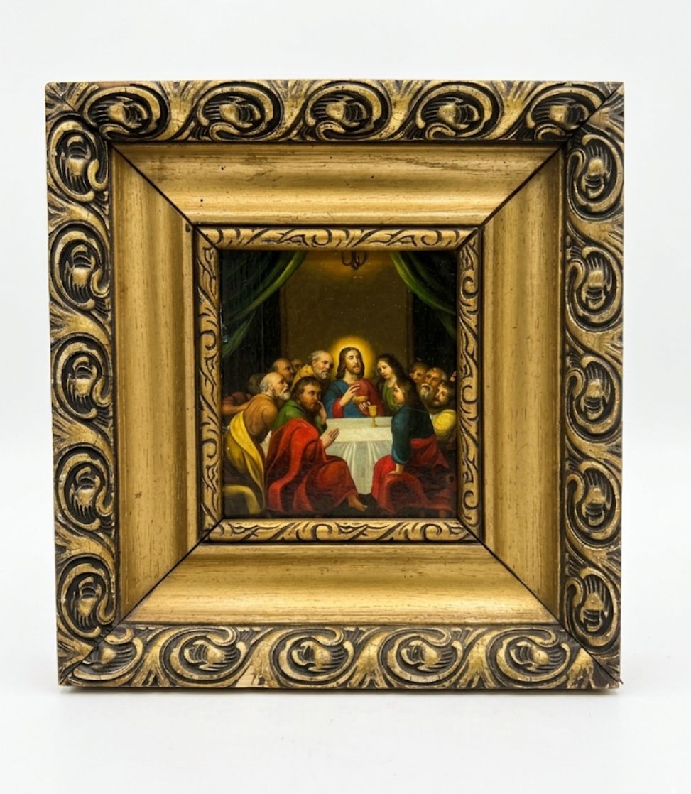 Dipinto a olio su lastra metallica di piccolo formato raffigurante l'iconografia classica dell'Ultima Cena. L'opera presenta Gesù al centro con l'eucaristia, circondato dagli apostoli in una scena caratterizzata da colori vivaci e contrasti chiaroscurali accentuati dal fondo scuro e dai tendaggi verdi. Il dipinto è inserito in una cornice monumentale in legno dorato riccamente lavorata con motivi a volute e foglie d'acanto a rilievo.