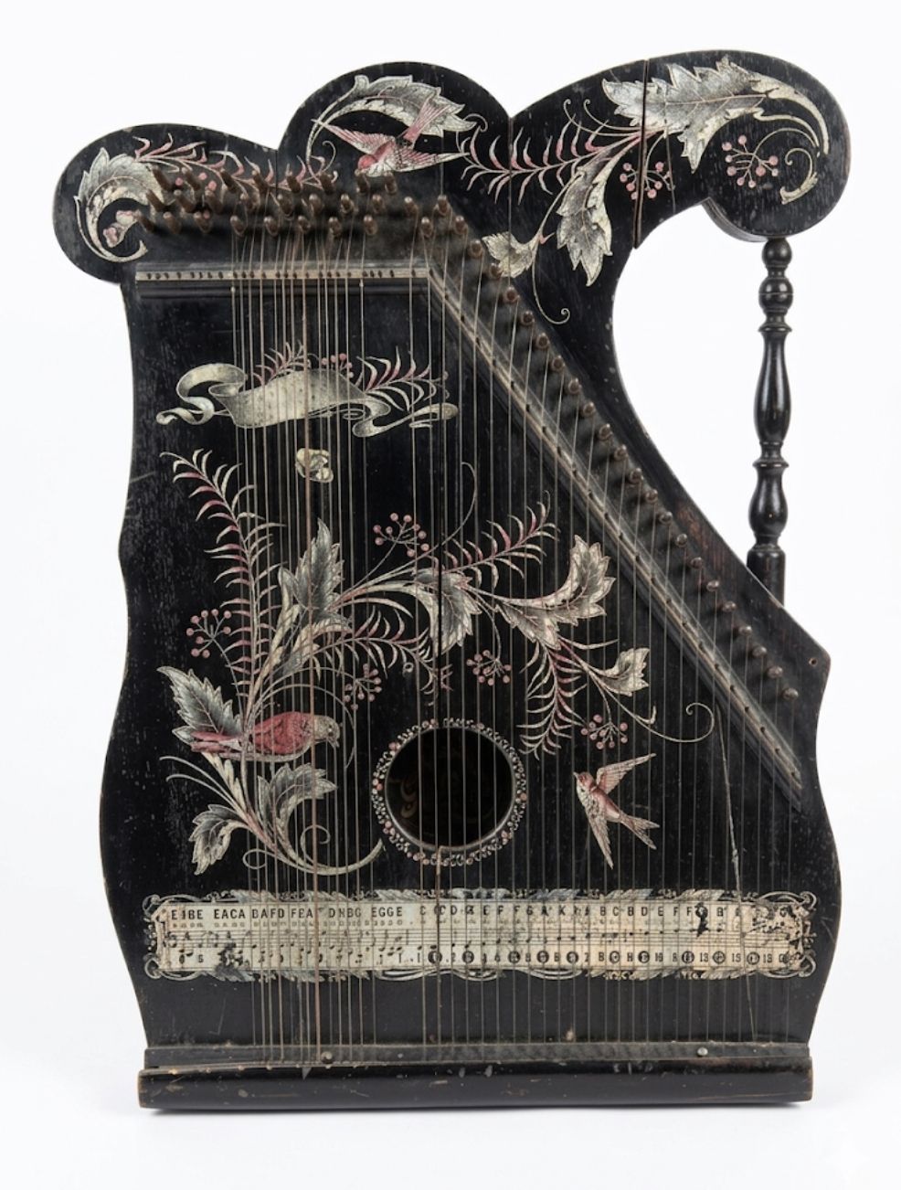 Cetra antica, strumento musicale vintage in legno laccato e decorato a motivi floreali, oggetto di antiquariato musicale