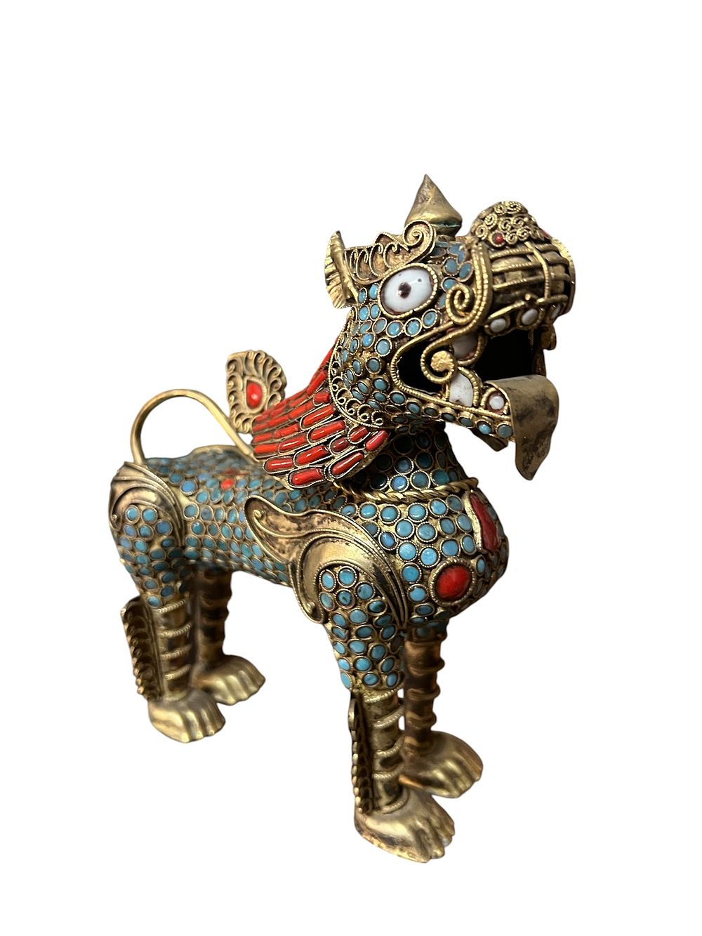 Raffinata scultura in bronzo dorato raffigurante un leone guardiano (Singha) della tradizione tibetano-nepalese. L'opera è interamente impreziosita da una fitta incastonatura di pietre semipreziose, tra cui turchesi a taglio cabochon e coralli rossi, che delineano il piumaggio e i dettagli ornamentali del corpo. La figura presenta fauci aperte, lingua estroflessa e dettagli finemente cesellati a mano nelle zampe e nella coda. Esemplare di grande impatto decorativo e pregio artigianale.