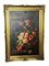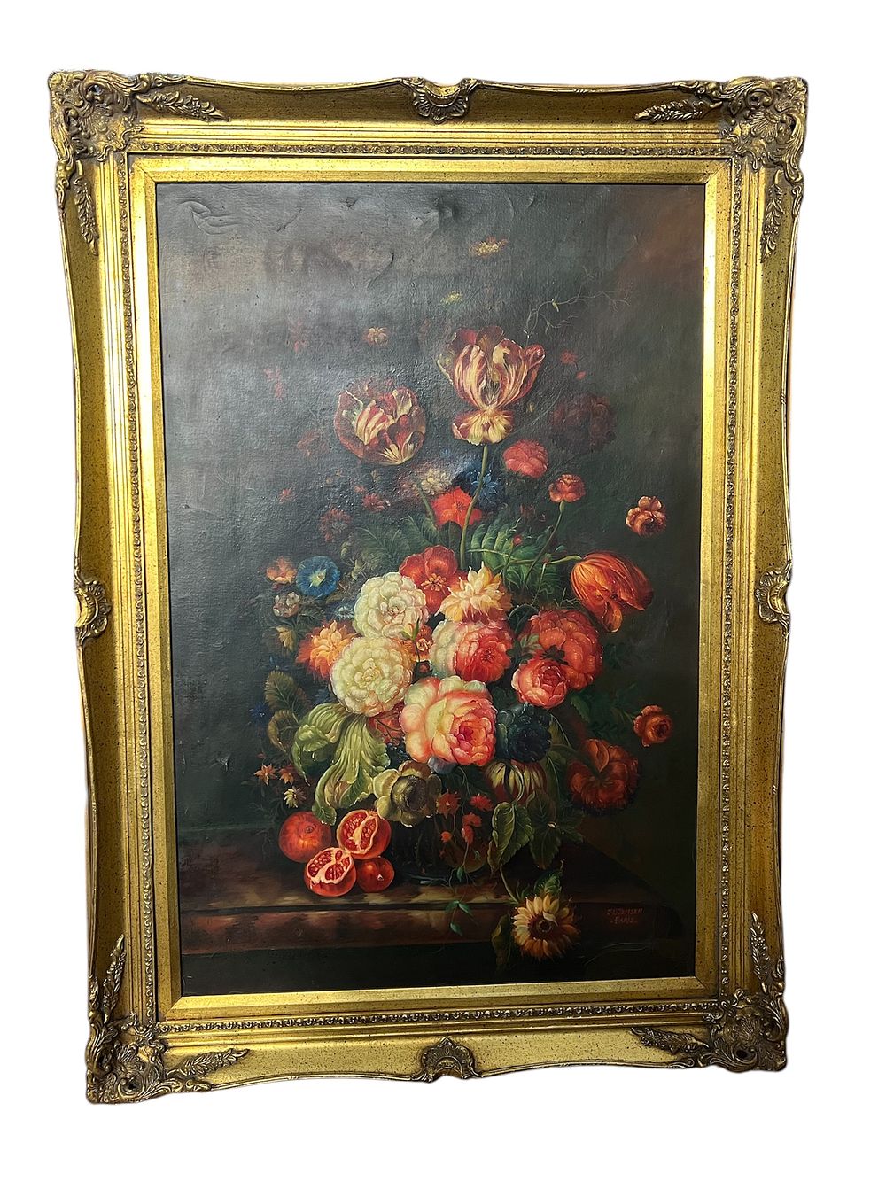 Importante e scenografica composizione floreale eseguita a olio su tela agli inizi del XX secolo. L’opera presenta un ricco bouquet di fiori variopinti, tra cui spiccano tulipani fiammati e rose, adagiati su un piano dove compaiono dei melograni spaccati. La stesura pittorica è vibrante, con un sapiente uso dei contrasti luminosi su fondo scuro di gusto fiammingo. Il dipinto è impreziosito da una bellissima cornice dorata coeva, riccamente lavorata con motivi a fogliame e volute agli angoli.