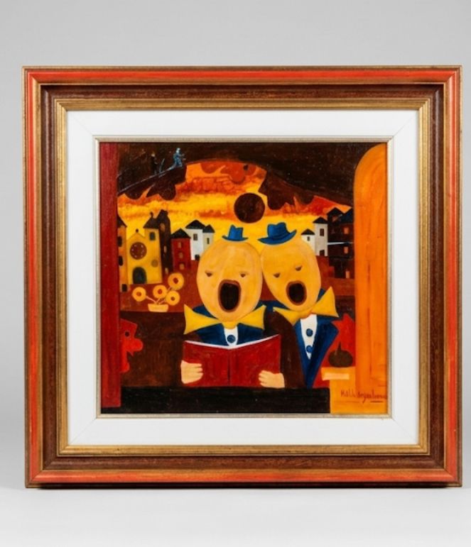 Affascinante opera d'arte contemporanea realizzata a olio su tela, intitolata "I Cantori". Il dipinto ritrae due figure maschili colte nell'atto del canto, con lo sguardo rivolto verso l'alto e le bocche schiuse in un'espressione di intensa partecipazione emotiva. Lo stile si distingue per una semplificazione formale di gusto naïf, con volti dai lineamenti marcati e volumi definiti. La tavolozza cromatica è giocata su tonalità calde e terrose, con un uso sapiente delle sfumature dell'arancio e del bruno che conferiscono all'opera una luce avvolgente e un'atmosfera poetica. L'opera è firmata in basso dall'autore e si presenta completa di una cornice lignea modanata con profili in oro e rosso, perfettamente coordinata con i toni della tela