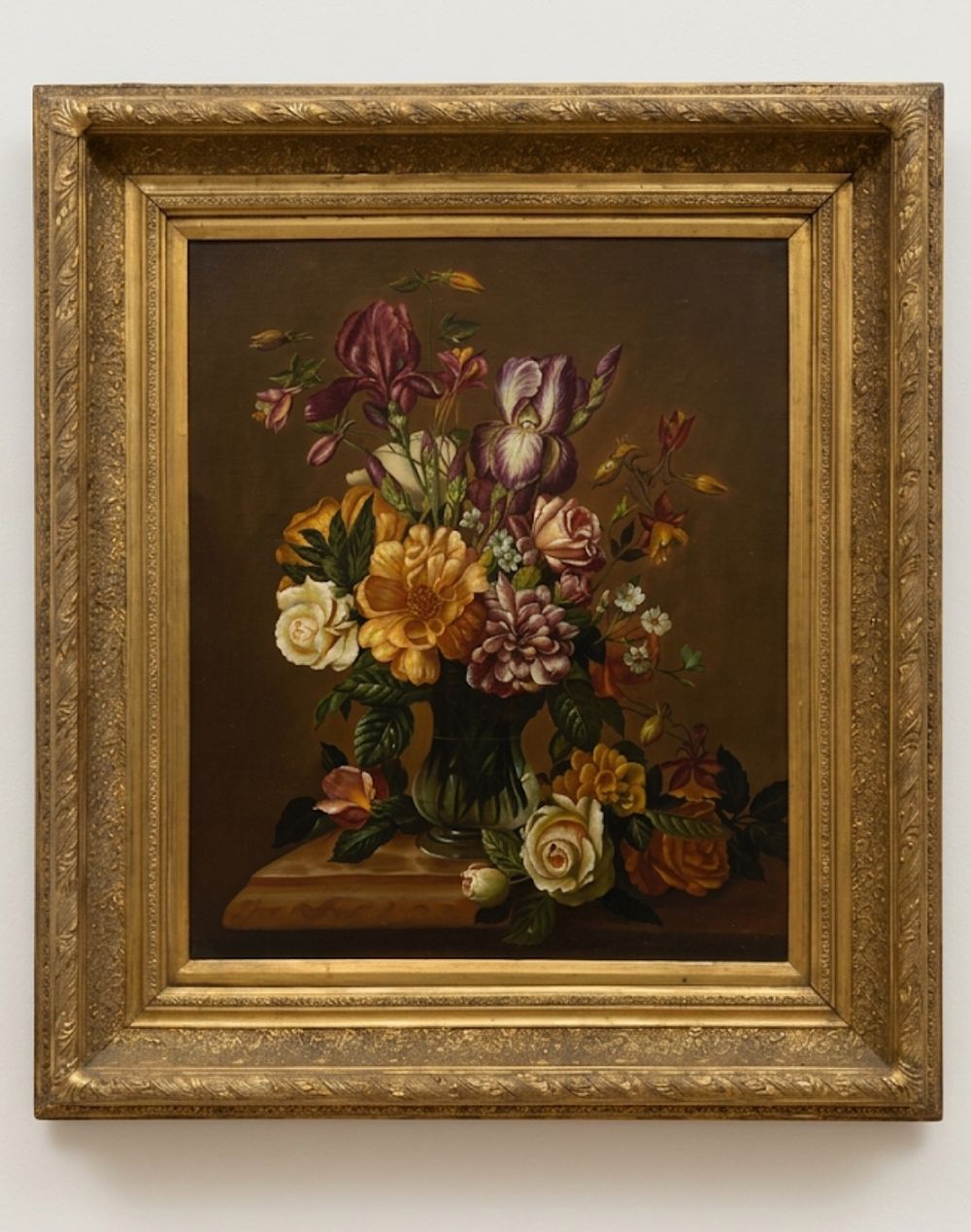 Raffinata opera pittorica a olio su tela della fine dell'Ottocento, che ritrae una natura morta con vaso e fiori-. Il dipinto è caratterizzato da una pennellata morbida e da un uso sapiente della luce che mette in risalto l-opera