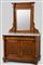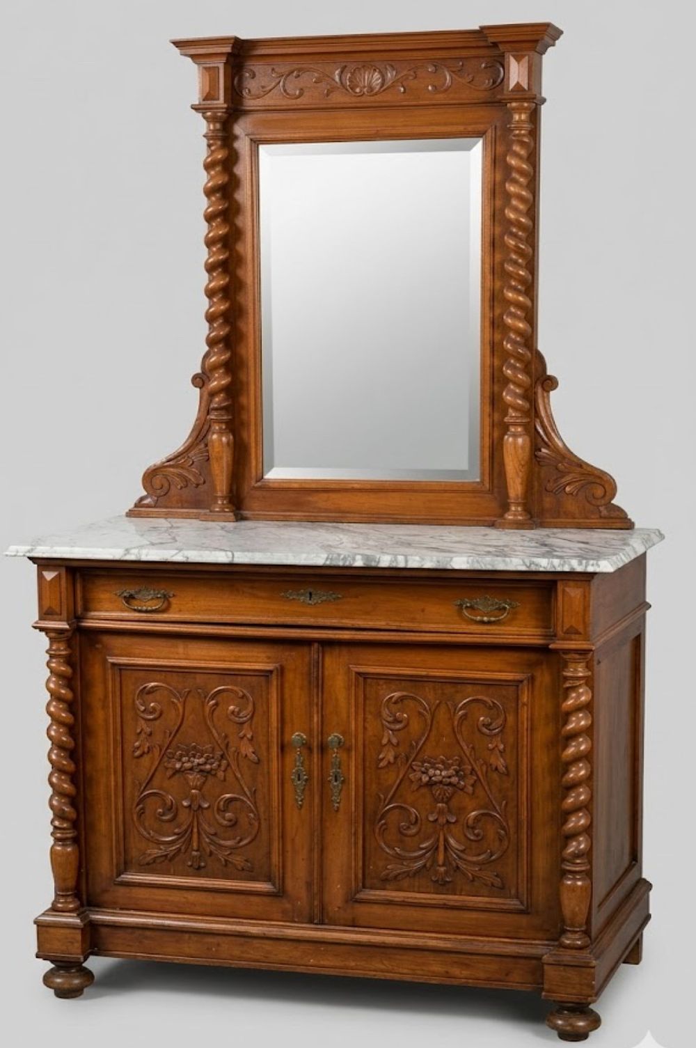 Elegante mobile a due corpi realizzato in legno di noce finemente intagliato, riconducibile alla manifattura eclettica della fine del XIX secolo. L’Alzata: Caratterizzata da una specchiera rettangolare centrale, incorniciata da una coppia di colonne a tortiglione scanalate che sorreggono una cimasa a cornicione aggettante. Il fregio superiore presenta un raffinato intaglio a motivo di conchiglia centrale e girali fogliacei simmetrici. Il Piano: Piano d’appoggio in marmo bianco venato di grigio, sagomato e levigato, che conferisce stabilità cromatica e prestigio al mobile. Il Corpo Inferiore: Base a due ante pannellate, ornate da ricchi intagli a rilievo con motivi floreali e volute a "C". Un ampio cassetto sottopiano completa la struttura, arricchito da bocchette e maniglie in bronzo patinato originali. I fianchi sono scanditi da mezze colonne tortili che richiamano il design dell'alzata. Sostegni: Il mobile poggia su quattro piedi a cipolla schiacciata, tipici della tradizione ebanistica classica. Scheda Tecnica Epoca: Fine XIX secolo (Storicismo/Eclettismo). Materiale: Legno di noce, marmo bianco venato, specchio al mercurio (o sostitutivo d'epoca), bronzo. Stato di Conservazione: In buone condizioni generali. Piccoli segni d'uso coerenti con l'età e la patina originale del legno. Ferramenta originale.