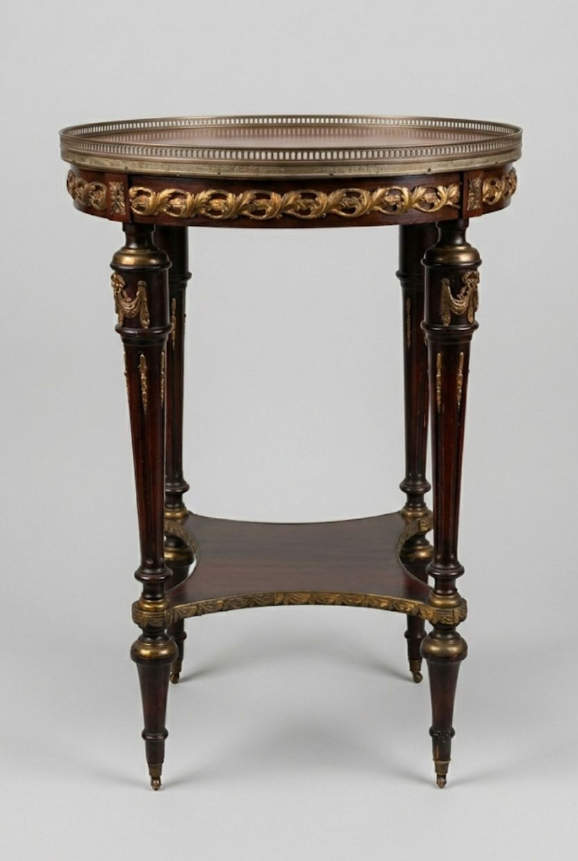 Raro ed elegante tavolino da centro (Gueridon) di epoca Primo Impero, esemplare della raffinata ebanisteria neoclassica francese. Il piano circolare è racchiuso da una galleria in ottone traforato a motivi geometrici. La fascia sottopiano è decorata da una sontuosa sequenza di fregi in bronzo dorato raffiguranti ghirlande di alloro e nastri, simboli tipici del repertorio decorativo napoleonico. Il mobile poggia su quattro montanti a colonna rastremata (a faretra), ornati nella parte superiore da capitelli in bronzo a motivo di drappeggio e anelli. I sostegni terminano con eleganti puntali in bronzo e sono raccordati da una crociera sagomata in mogano, che conferisce solidità alla struttura slanciata. La qualità della cesellatura dei bronzi e la scelta dell'essenza lignea suggeriscono una provenienza da un'importante officina di ebanisteria dell'epoca.