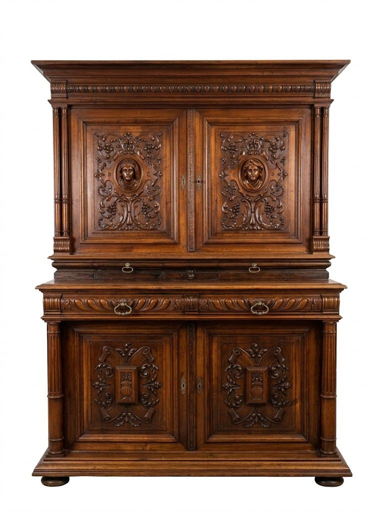 Raffinato mobile credenza a doppio corpo d'epoca, realizzato in Francia tra la fine del XVIII e gli inizi del XIX secolo. Questo pezzo si distingue per la solidità costruttiva e l'eleganza delle decorazioni, tipiche dell'ebanisteria francese del periodo transitorio tra lo stile Luigi XVI e lo stile Impero. Caratteristiche principali: Struttura a Doppio Corpo: Il mobile è composto da due sezioni sovrapposte, con una parte superiore leggermente arretrata rispetto alla base. Materiale: Realizzato in legno pregiato, probabilmente noce o ciliegio, con una calda patina naturale che ne esalta le venature. Corpo Superiore: Dotato di due ante pannellate, ciascuna arricchita da specchiature centrali sagomate e modanature geometriche discrete. La cimasa superiore presenta una linea pulita con una leggera cornice aggettante. Piano Intermedio: La base superiore si allarga a formare un comodo piano d'appoggio, sostenuto da mensole laterali sagomate che incorniciano il corpo centrale. Corpo Inferiore: Presenta due cassetti allineati sotto il piano d'appoggio e due ante sottostanti, che riprendono il motivo decorativo della sezione superiore. La base termina con una zoccolatura solida e piedini sagomati. Ferramenta: Maniglie dei cassetti e bocchette delle serrature originali in metallo brunito (probabilmente ottone), finemente lavorate. Stato di conservazione: Il mobile si presenta in buone condizioni generali, con i normali segni del tempo che ne confermano l'autenticità e il fascino storico