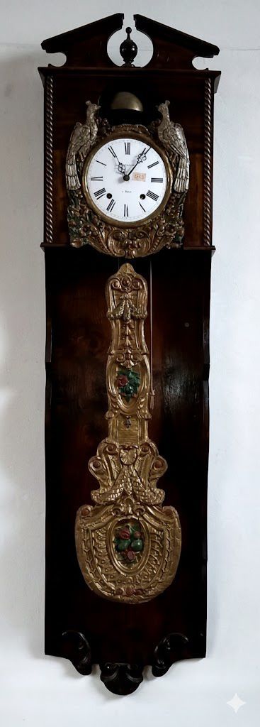 Decori Frontali (Bronzo Dorato/Legno Intagliato Dorato): La caratteristica distintiva è l’applicazione centrale e sulla cornice del quadrante di ricche decorazioni in bronzo dorato.